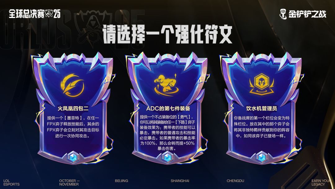 10月14日,金铲铲之战全球总决赛限时玩法【冠军乱斗】模式上线!全新强化符文等你解锁!