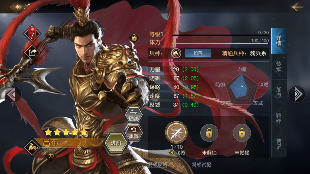 吕布在游戏中是顶级物理输出的代表,超高的基础属性和成长率能在开荒时提供很大的优势。在与系统土地守军进行作战时快速消灭敌军。另外,吕布的速度属性也属于中上水平(一般以1.5作为将领速度的分界点),在开荒过程中率先对敌军发起攻击。