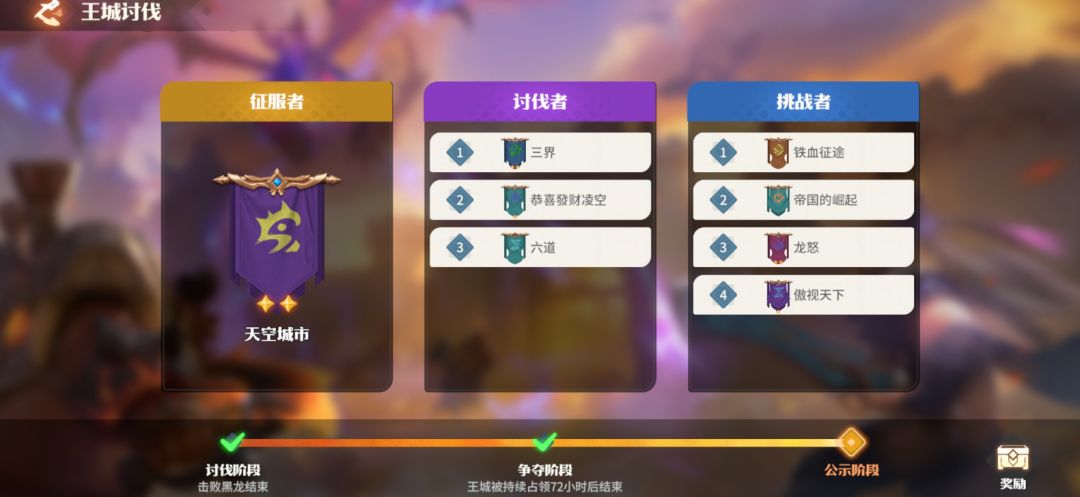【大秦王朝】延续强势表现,在多场围绕聚落与关隘的争夺中持续占据上风,与【应天书院】的同盟关系稳固,凭借高效攻城节奏与领地掌控力,稳居战局主导地位。最终【大秦王朝】成功拿下本次剧本征服者。