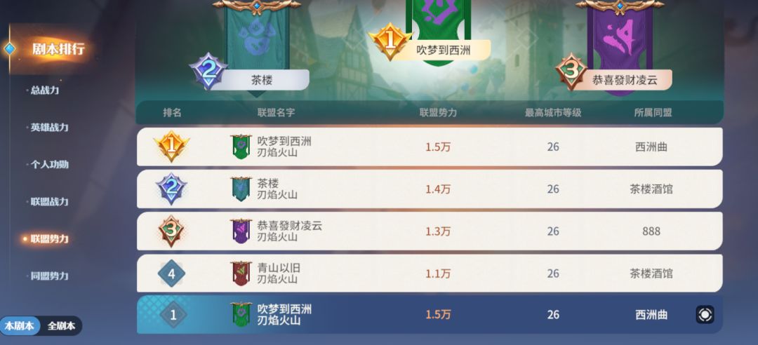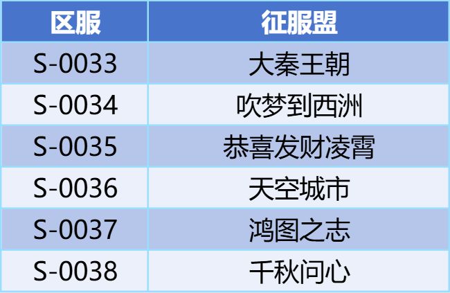 S-0034服开服后,【吹梦到西洲】【茶楼】【恭喜发财凌云】三盟强强联合,迅速统一全区。最终本区服由【吹梦到西洲】联盟拿下本次剧本征服者。