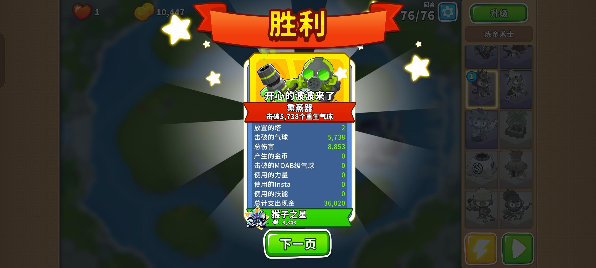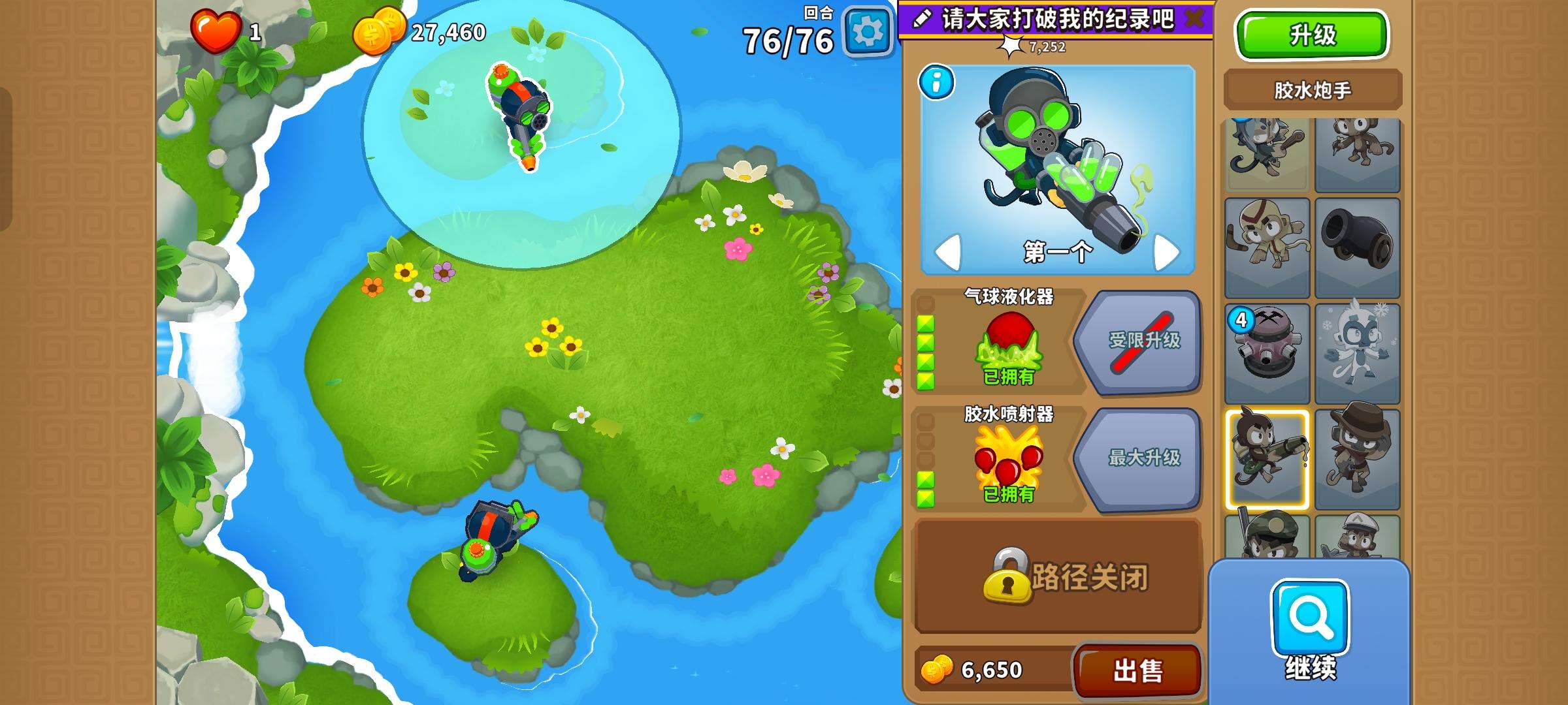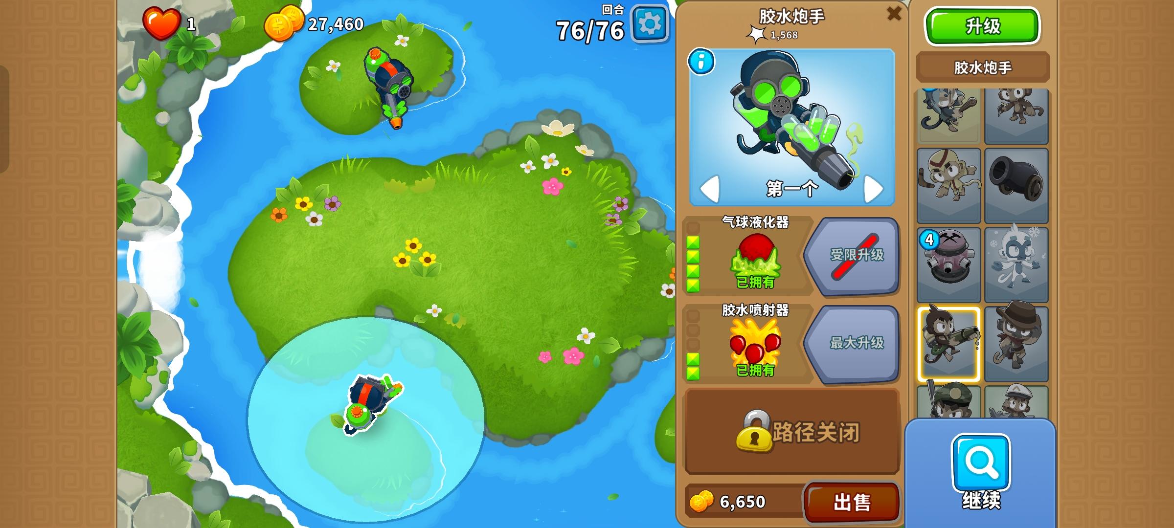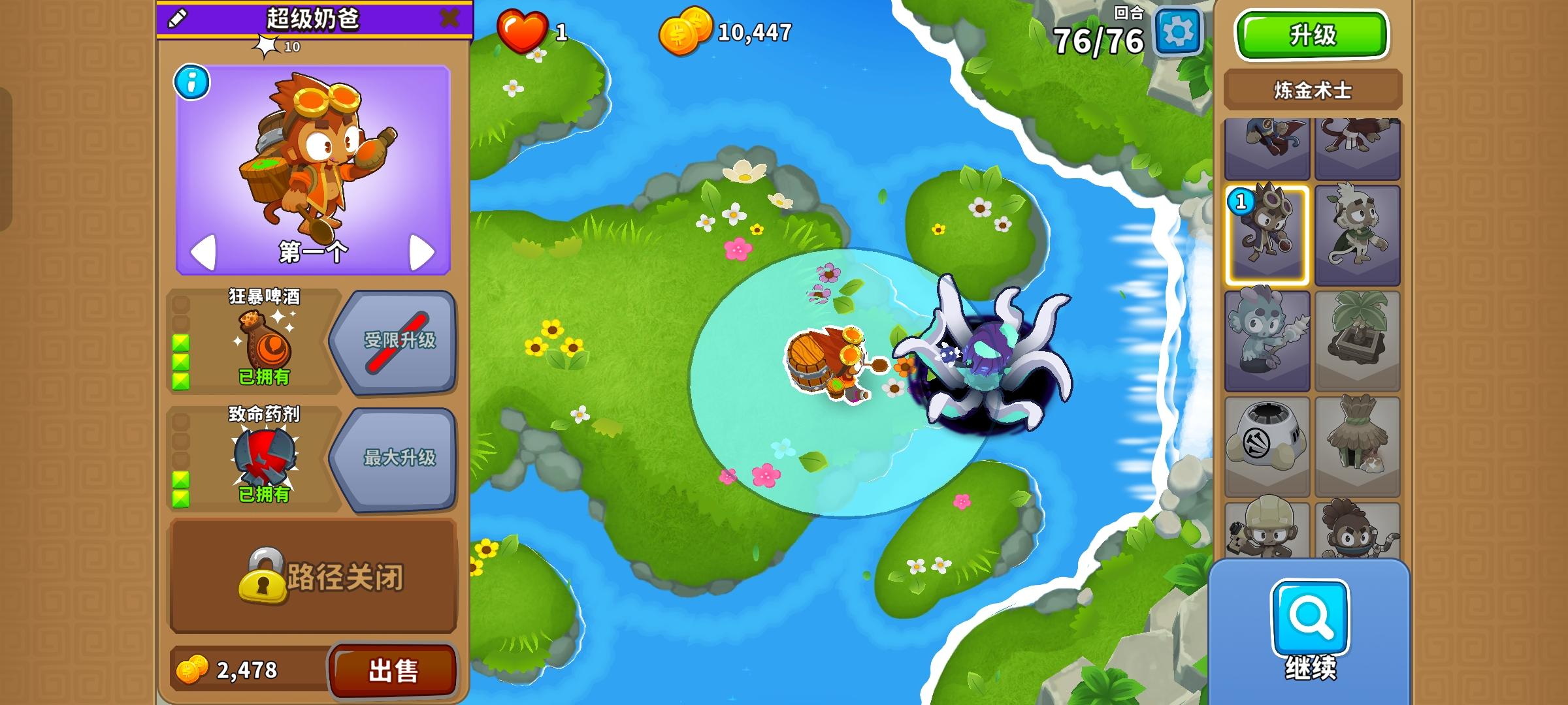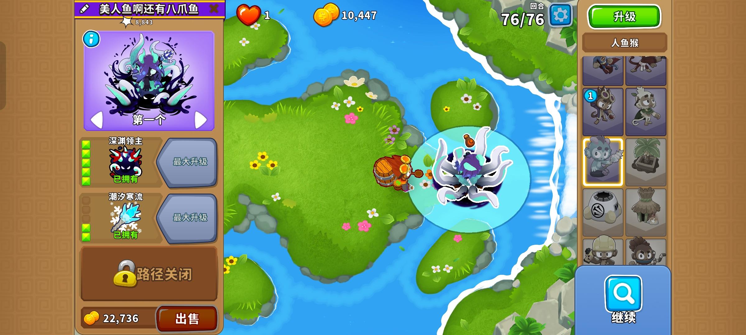 还可以在图上位置放下520人鱼猴(范围更大就说明是放在水里),外加320炼金术师辅助它,也能利用高伤害解决所有陶瓷气球!