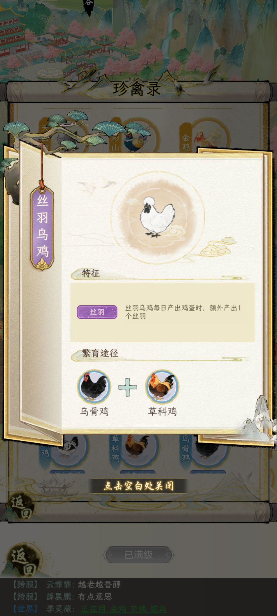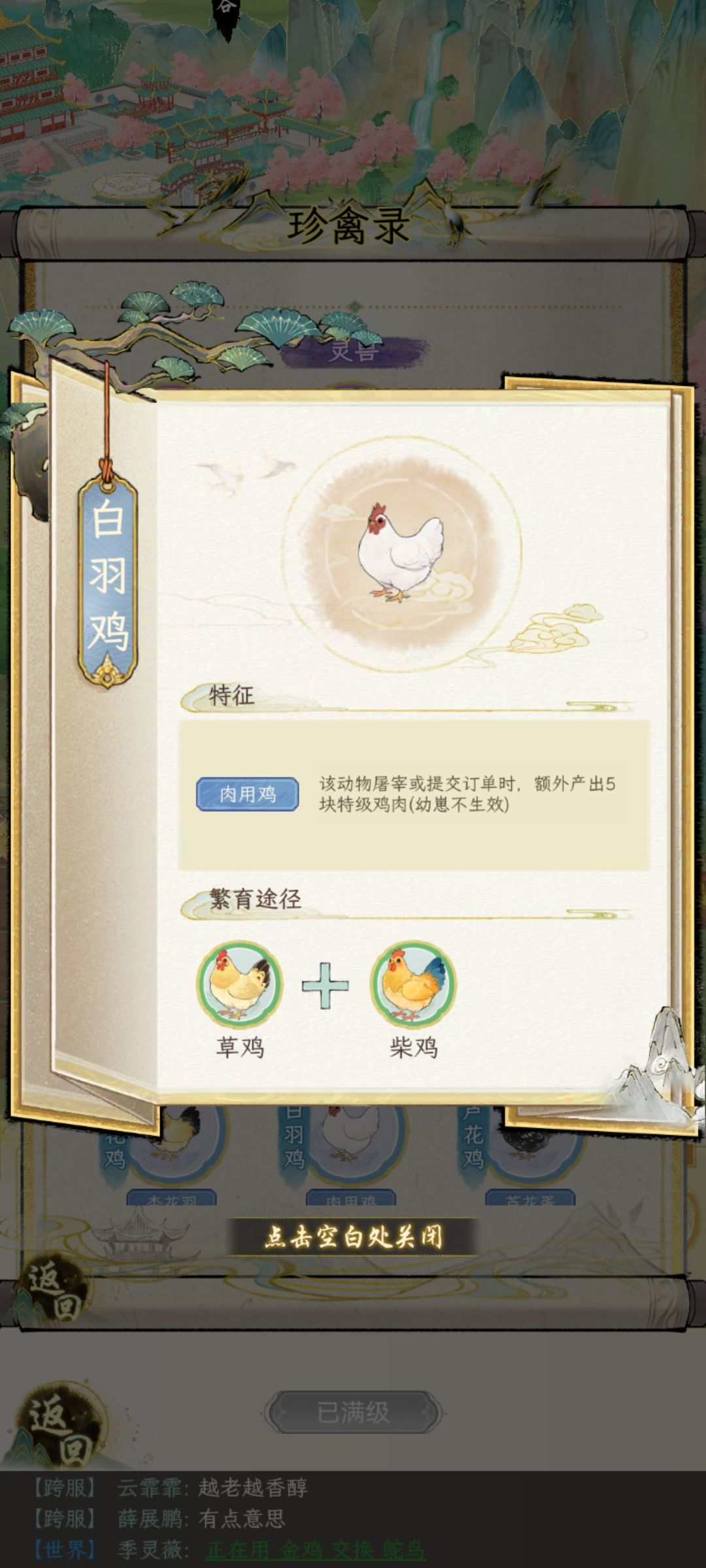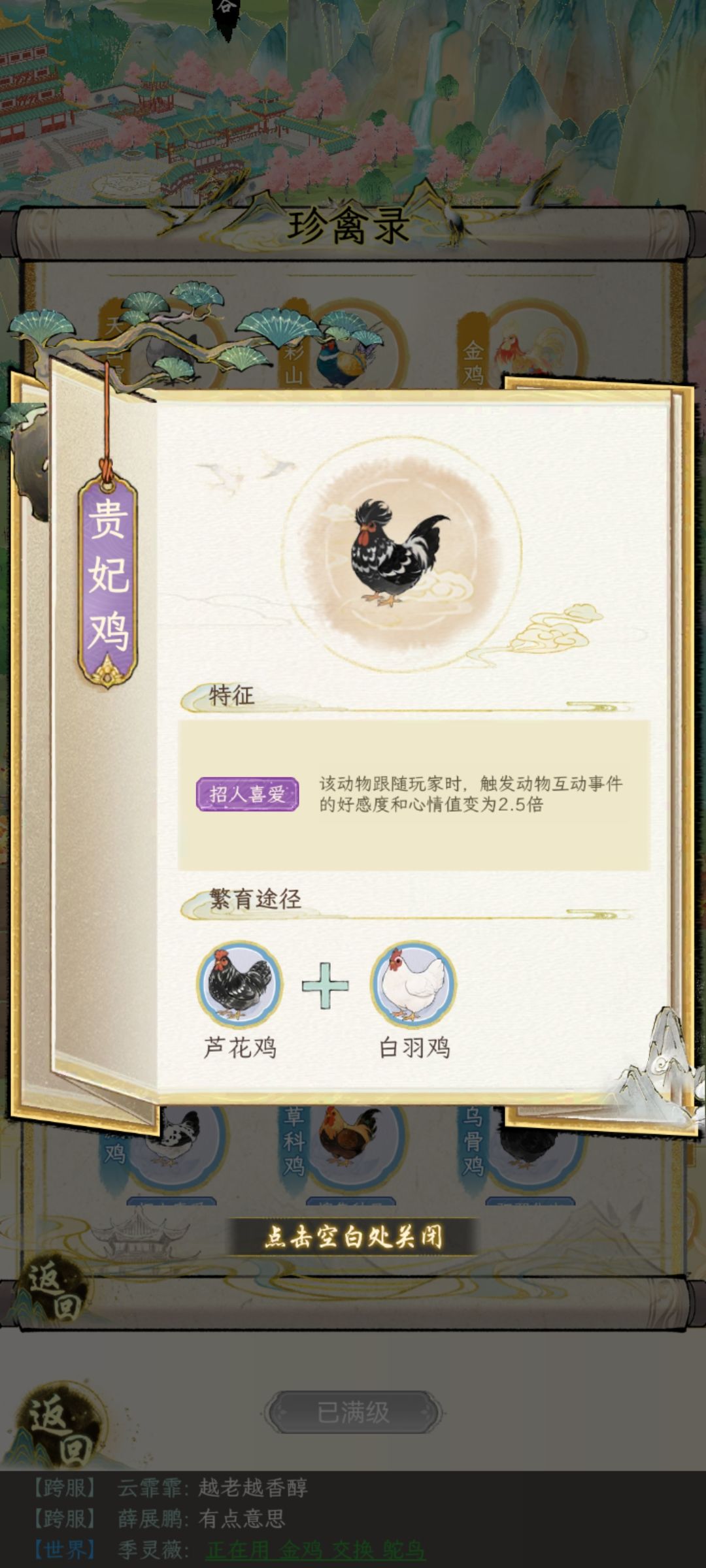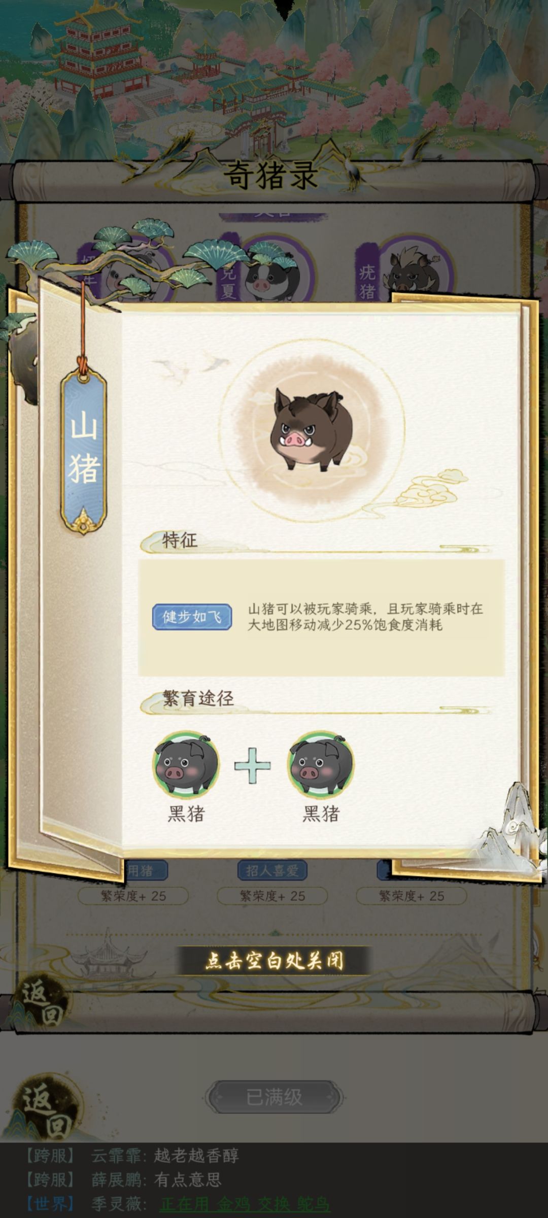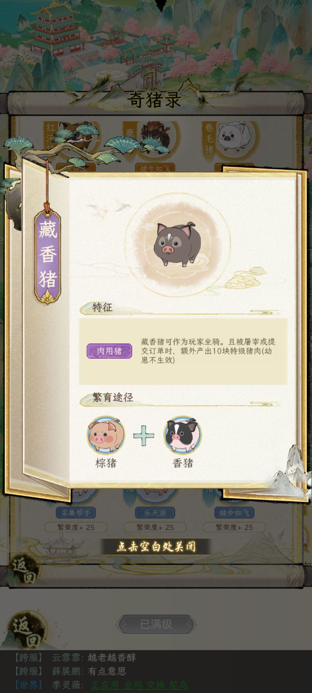这个时候根据房屋等级(3猪1鸡,3猪2鸡, 有鸡圈重复养猪的操作)这时候应该最少也有2—5只招财猪,然后继续繁殖。当你发现招财猪快没位置的时候,拿八眉和藏香猪去找人换其他紫猪,紫鸡图鉴互换。