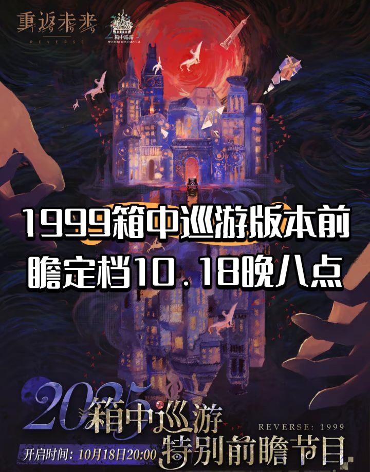 10月12日,重返未来1999官方正式宣布重返未来1999箱中巡游限定版本前瞻正式定档10月18日晚8点,届时将会揭晓1999箱中巡游版本的全新限定角色以及版本福利等内容,参考去年同期的福利来说箱中巡游版本的福利应该是不会差滴,还是很值得期待滴