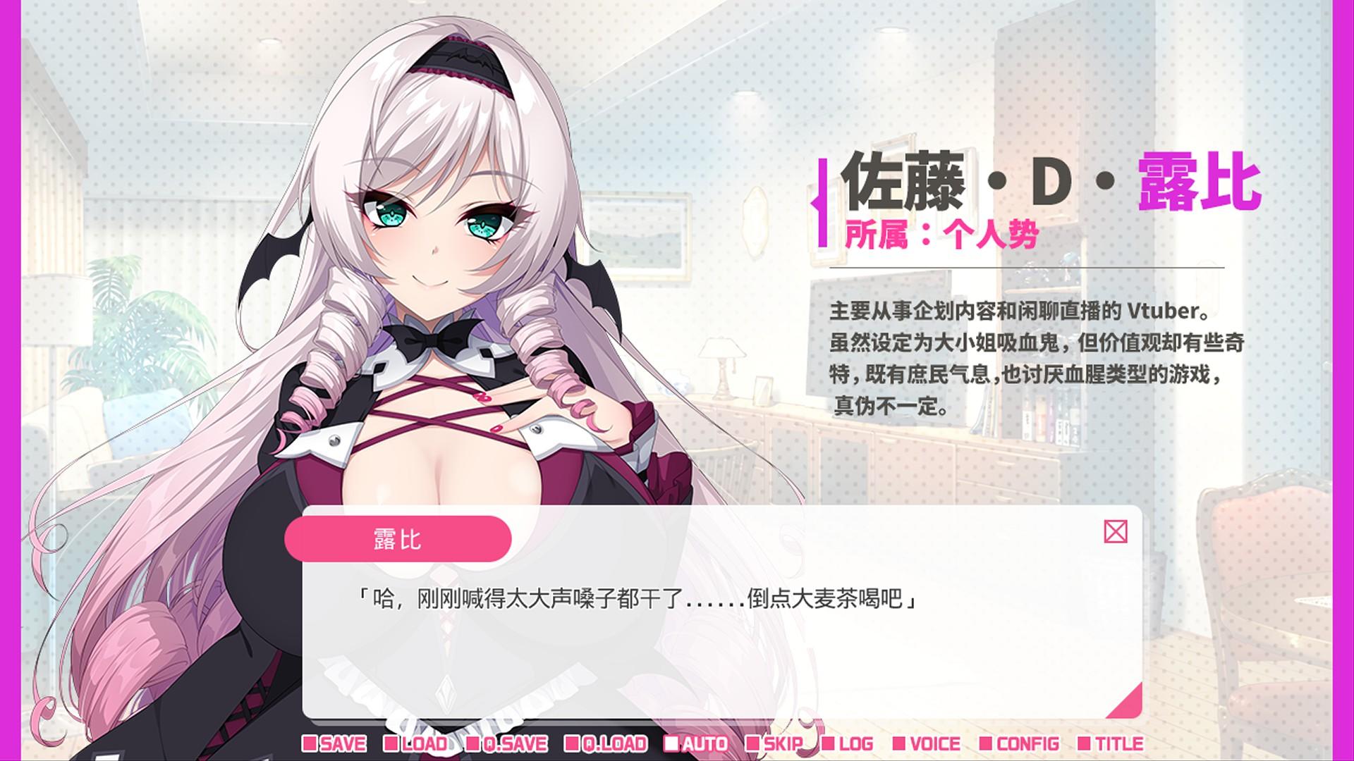 就有点像比较典型的没有傲娇属性的大小姐女主形象,感情循环递进,非常教科书式的剧情,因为是吸血鬼所以有个在满月就会“食欲大增”的设定,在游戏中还是个善解人意贤惠的妻子形象。