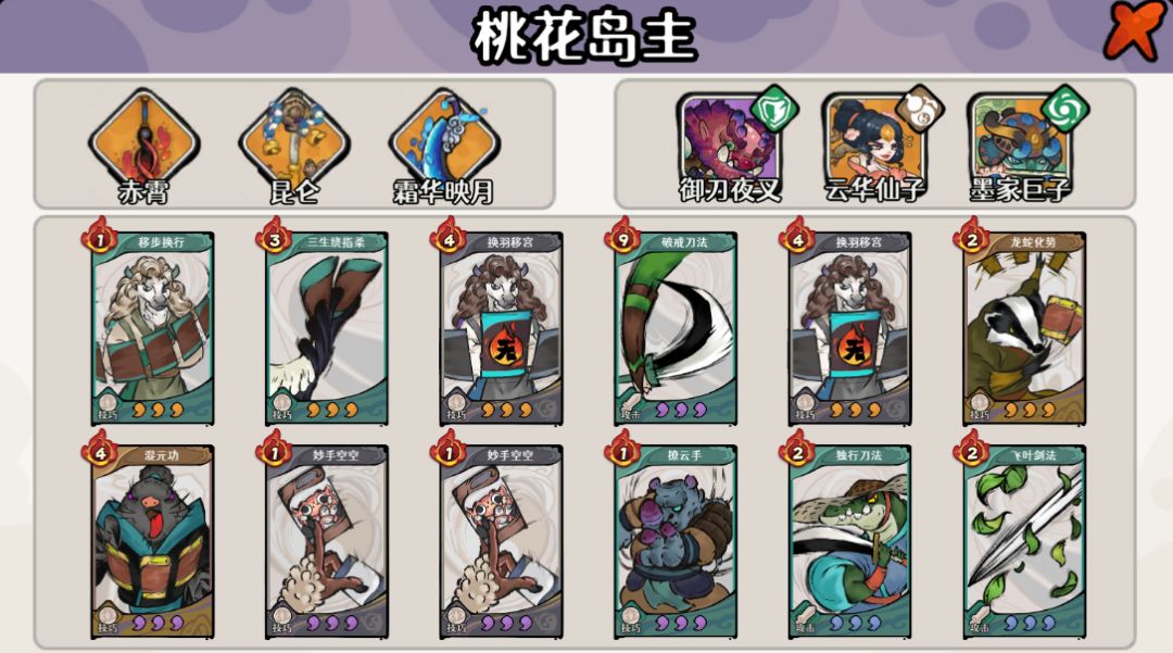 墨子(回返核心),御刀夜叉(风系+抽攻击牌),云华(抽武侠牌+怒气)