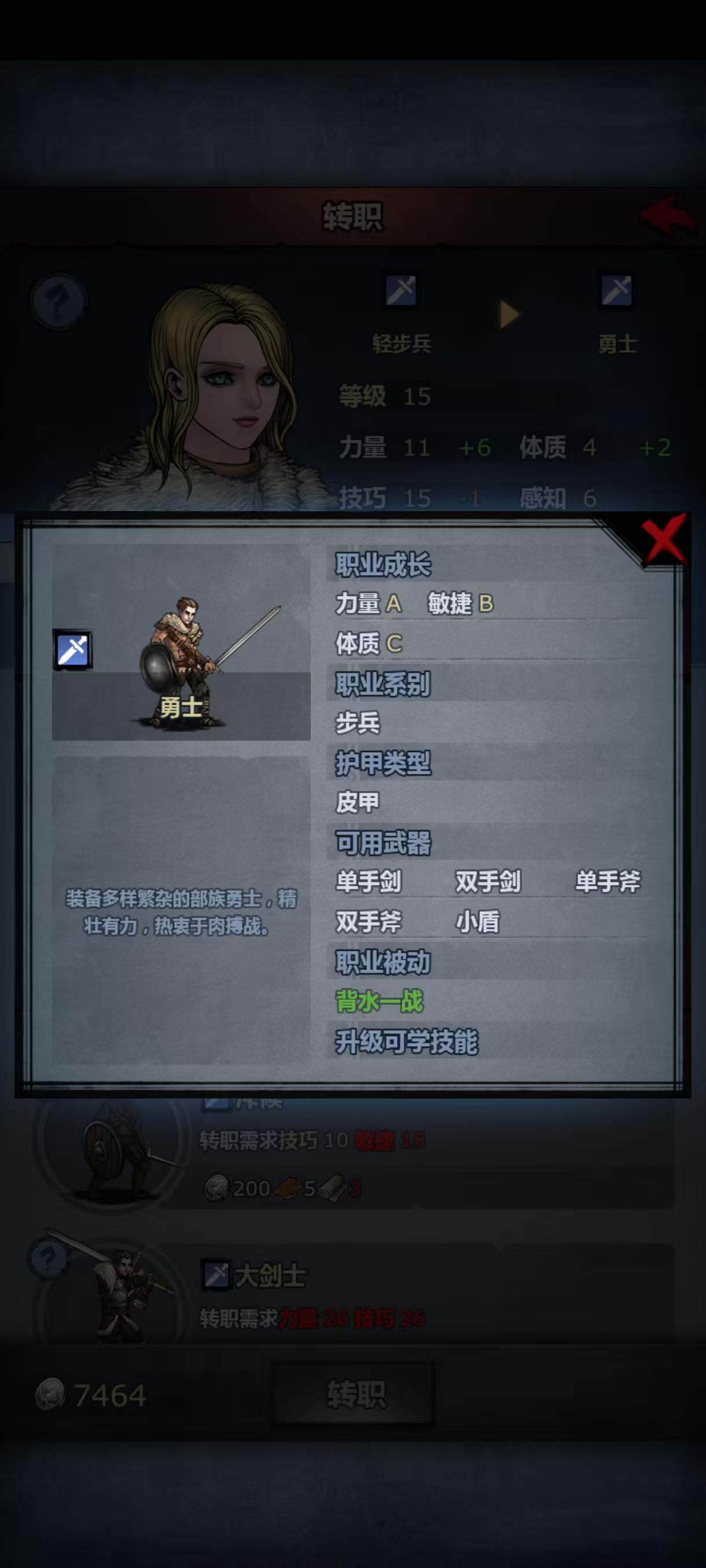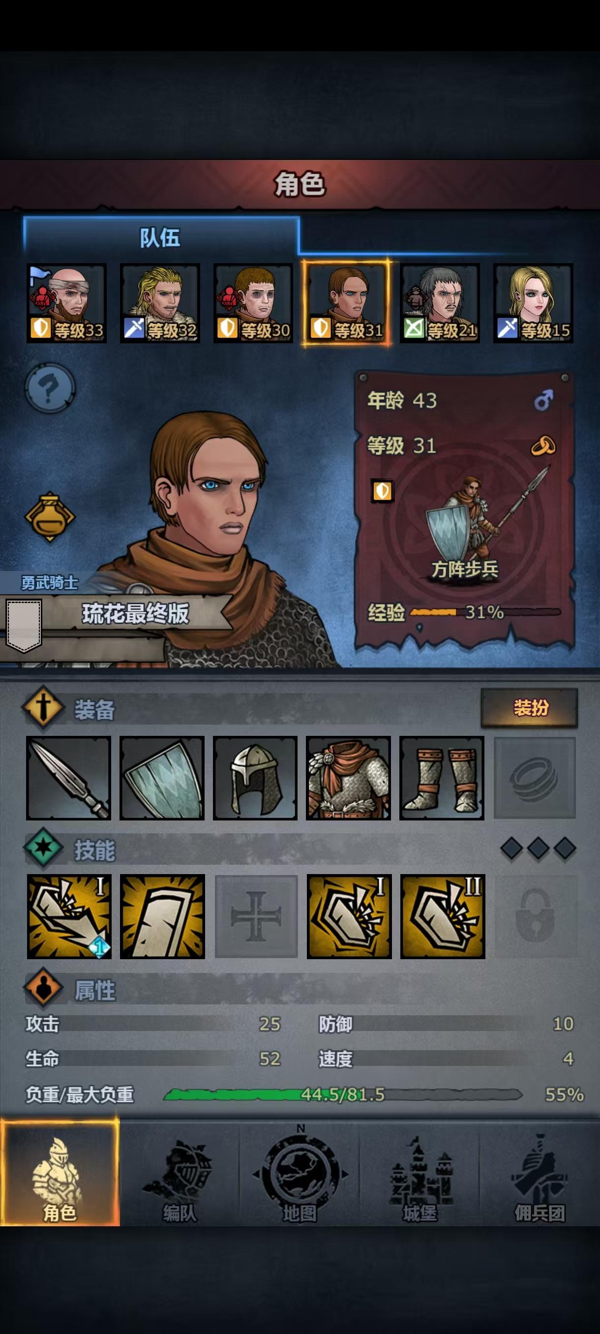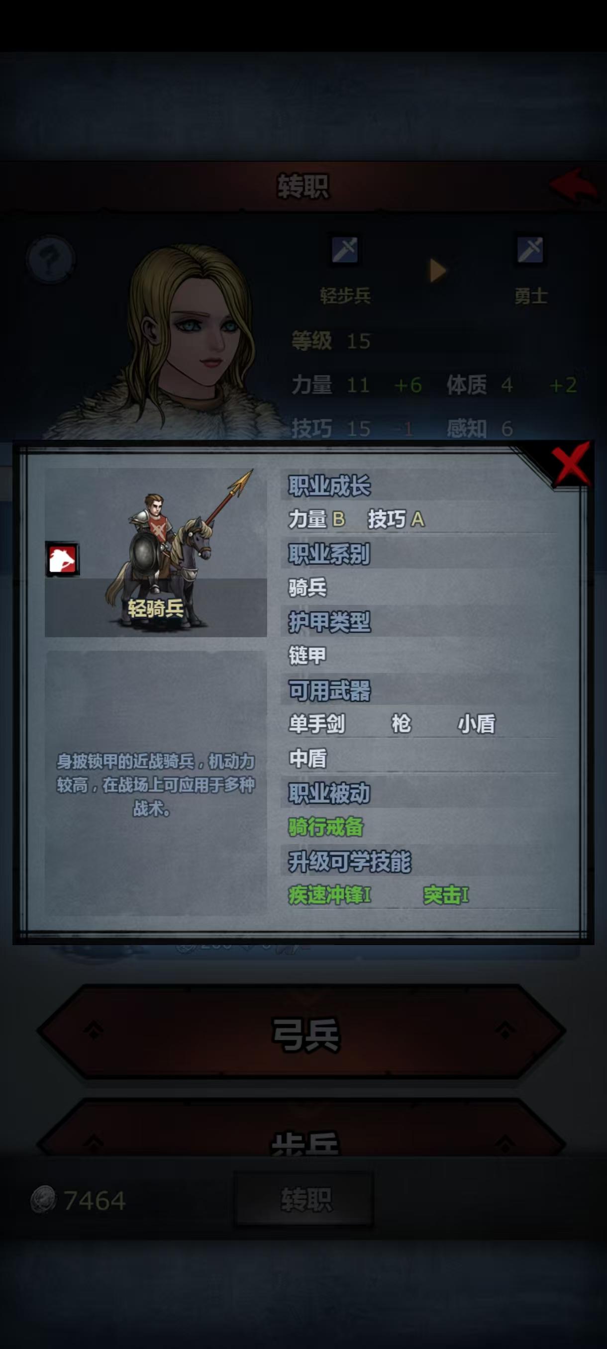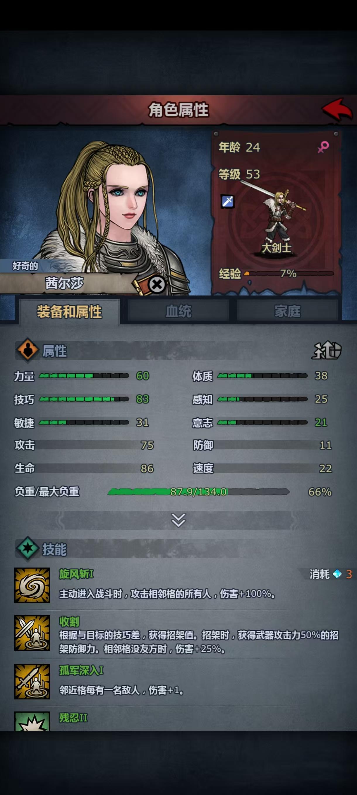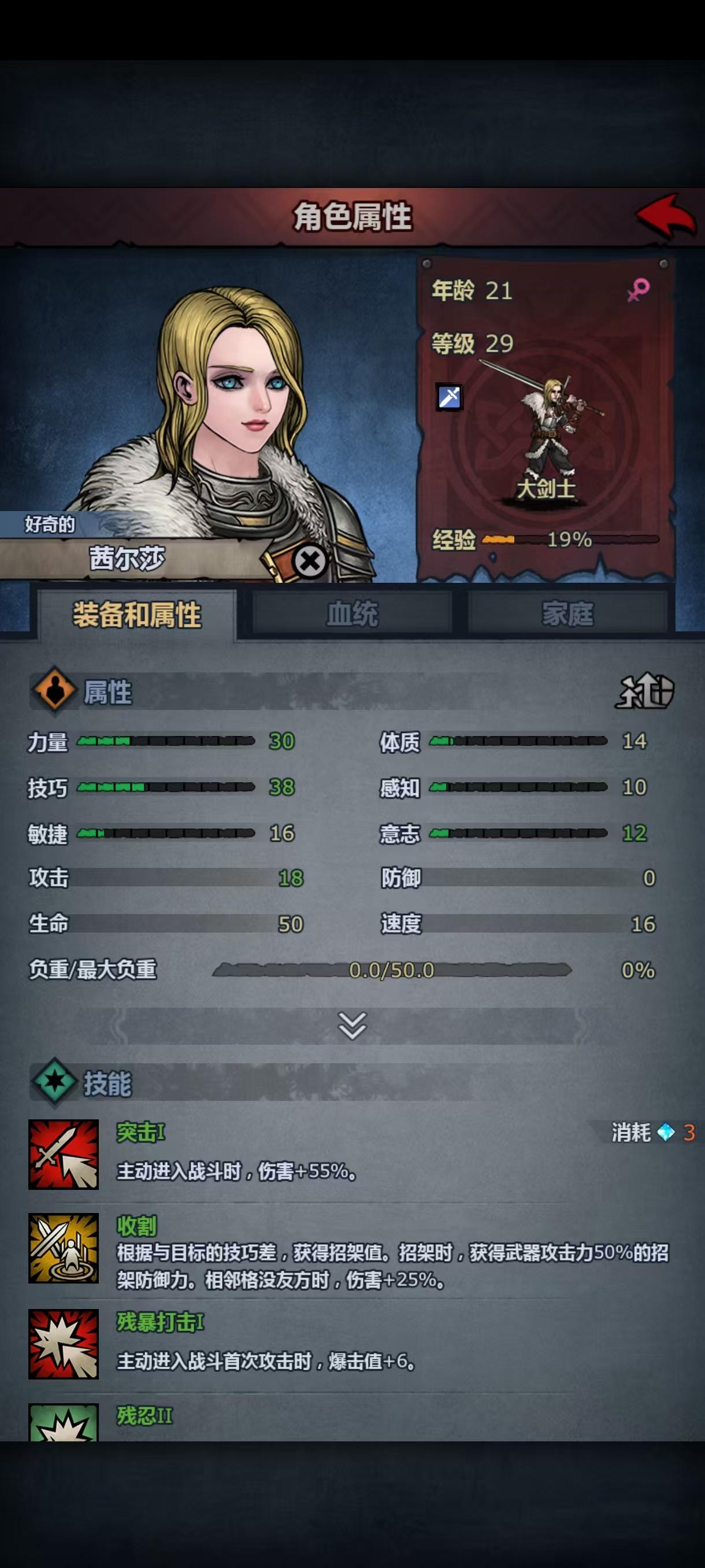 第二次攻略主线失败了,依然被波顿镇的重弩重甲殴打,小公主这次上阵了,但是转大剑力量不够,转方阵步兵体质不够,让我狠狠感受到了六维中a和c的差距,虽然最后也是转上了大剑,但是光数值技能就有十一个(没错,我把小公主从重步兵到骑兵轻步兵转了一大圈,技能等级没有一个高的😭)