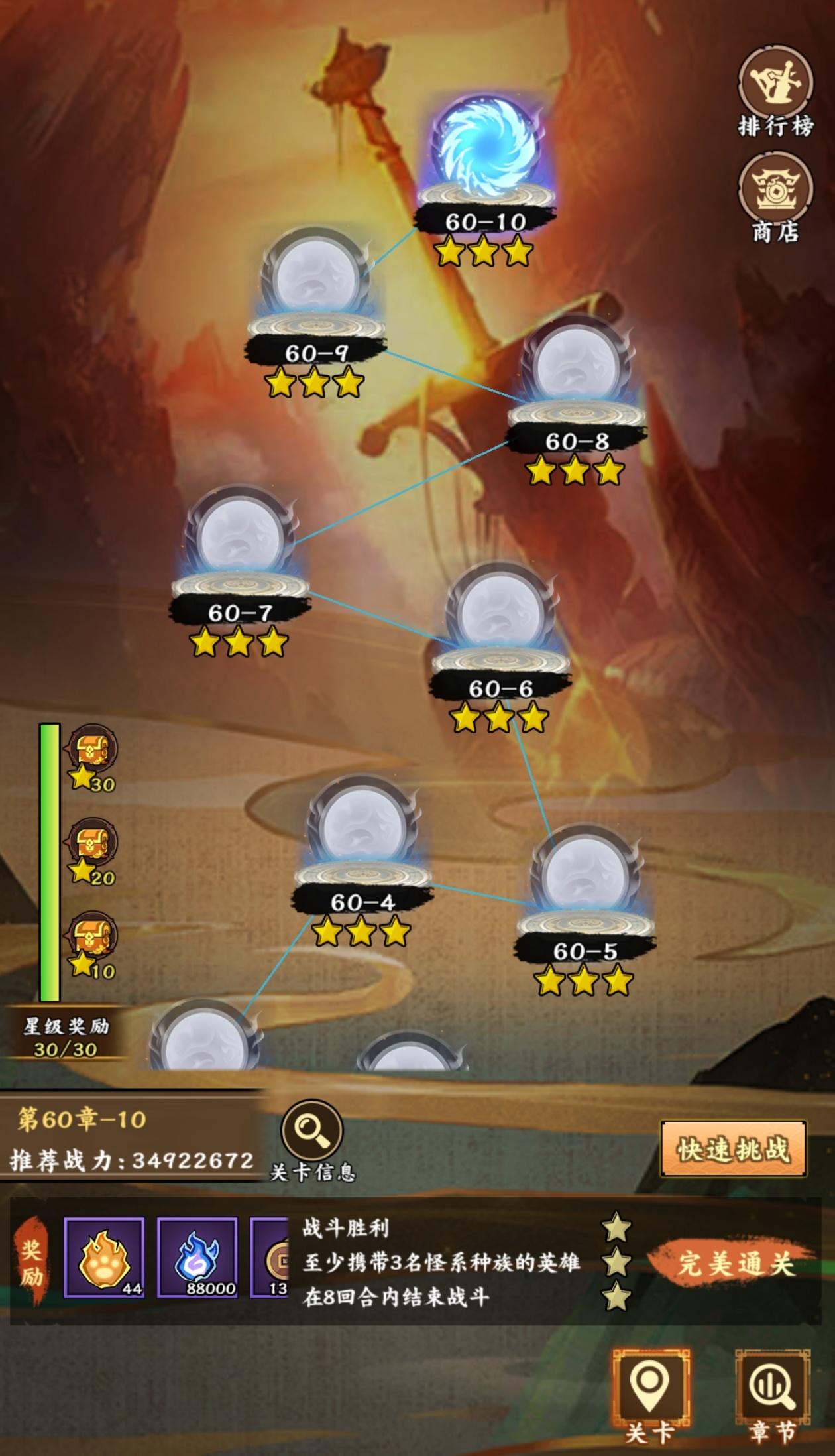 按照要求一键上阵英雄挑战,达到一定星数可以获得勾玉奖励,可以先通关后补星,点击右下角快速挑战,有补星的选项;