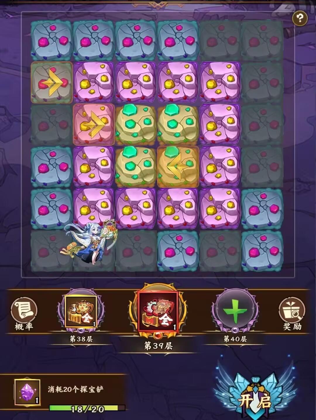 主要拿各种养成资源的活动,每次开启消耗1探宝铲随机移动1格(同圈之内到处跳,不是往相邻的格子走),移动到带箭头的格子可前往下一圈,内圈箭头进入下一层。每消耗20个探宝铲给1秘宝遗块。