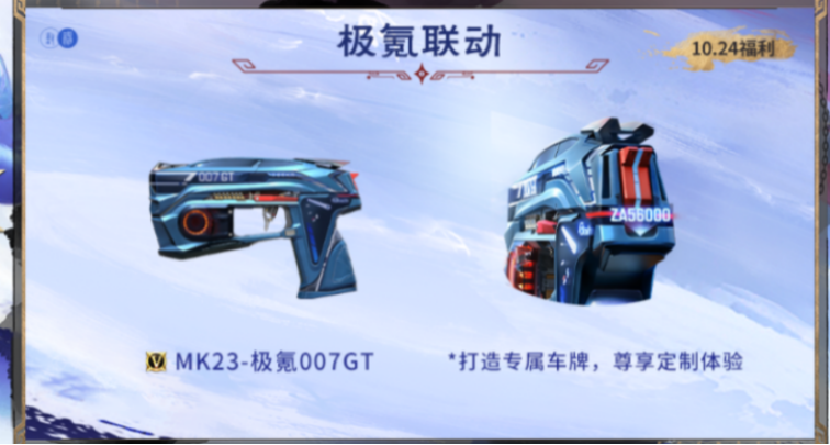 爽扣节第一波福利COP 357大家都领到了吗?10月24日起,爽扣节延续狂欢,为大家带来了全新极氪联动福利武器MK23-极氪007GT,CFer们可自定义车牌,靓号自选,极氪出发!