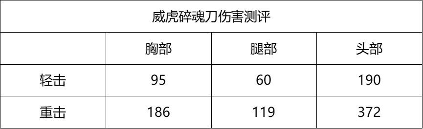 使用威虎碎魂刀时,轻击时除非直接命中头部,否则需要两次攻击才能击败对方。而重击时,无论是第一段还是第二段,攻击到敌方的任意部位,都可以直接击溃对方。具体的伤害数值如下表所示。