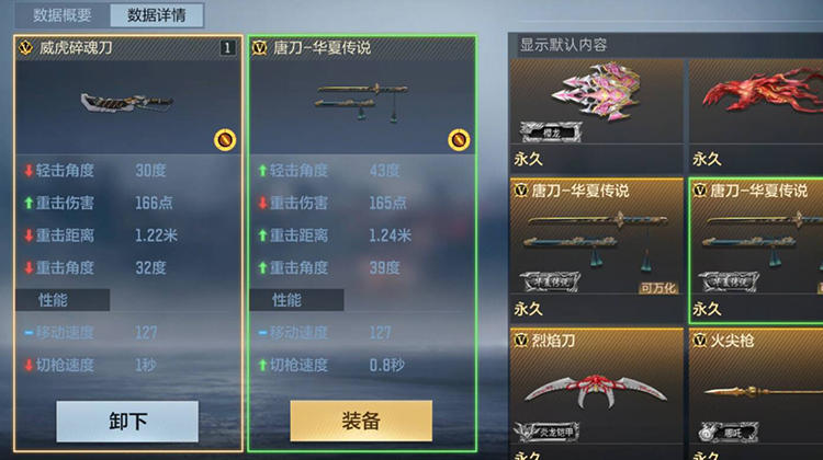 将威虎碎魂刀与同样为二段击的武器斩神刀以及唐刀-华夏传说进行对比。轻击距离方面,斩神刀唐刀-华夏传说;切枪速度,唐刀-华夏传说>威虎碎魂刀>斩神刀。