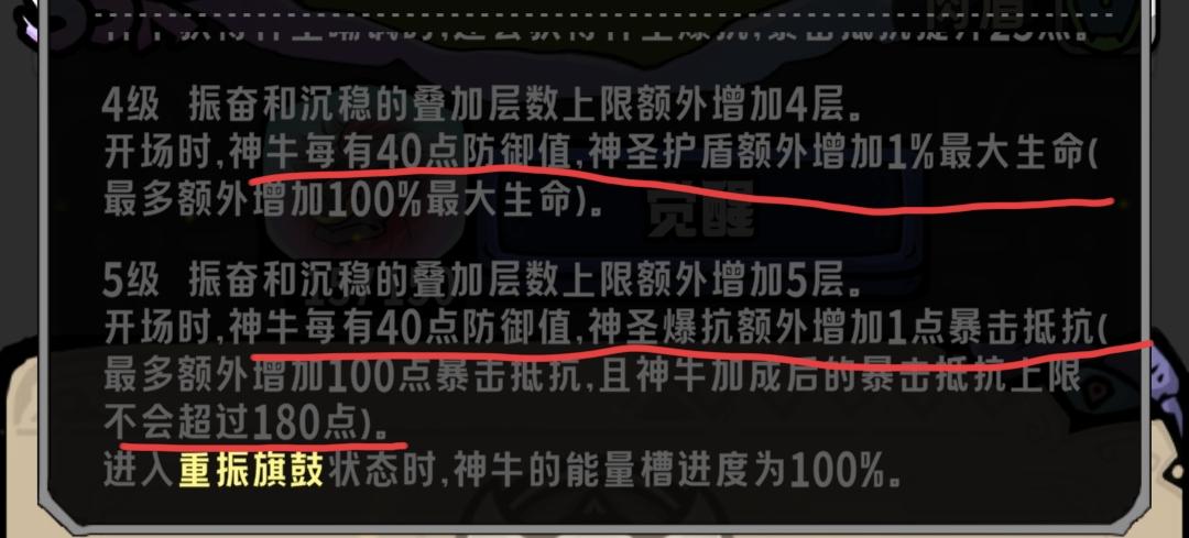 觉醒五的牛堆4000防以后,在防守端神圣嘲讽下会增加100抗暴和100血,4k防要等版本更新才能达到
