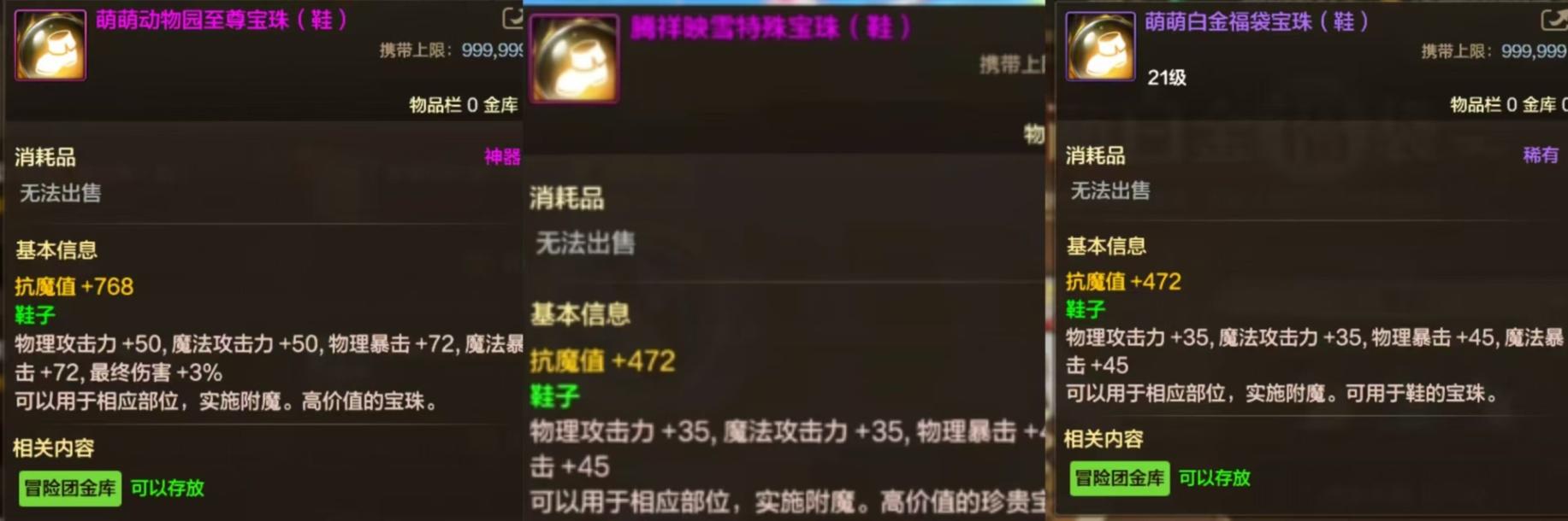 白金福袋鞋子宝珠属性和去年的至尊鞋子宝珠一致,真应了那句话“早买早享受,晚买享折扣”。平民玩家没买过宝珠用的是45或者59暴击卡,白金鞋子宝珠增加两百多抗魔和35双攻。
