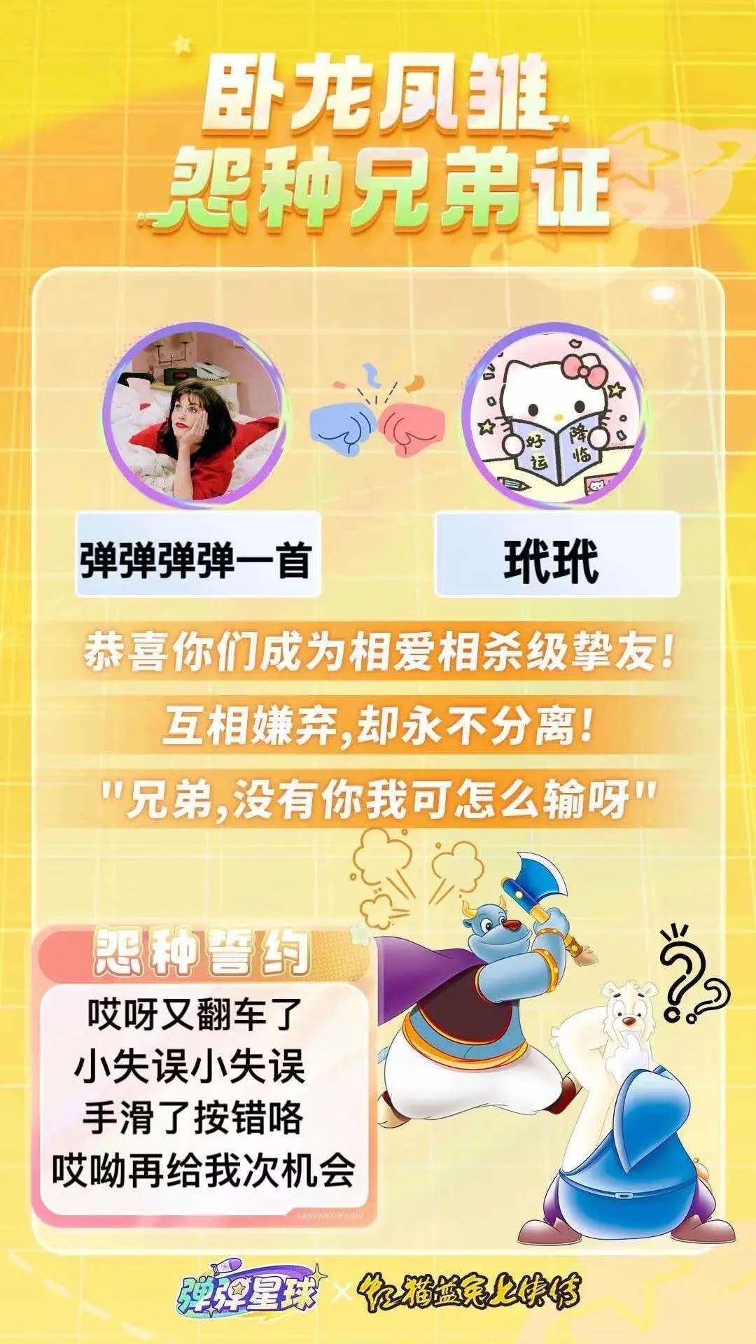 “紧急通知!本区服惊现一对‘迷惑行为’组合正式领证成团,主打一个"互相伤害,快乐加倍"!我是气氛组兼首席坑货,擅长在关键时刻打出让队友沉默的迷之操作,专业制造欢乐。她是战术大师兼首席受害者,前一秒还是稳定带飞的大腿,下一秒可能就被队友带偏,主打一个心态稳定。别问姐妹在弹弹星球啥战术,问就是'互相拆台+极限救场'!你把炮弹扔我脚边,我立马打开护盾救你脸。打不过就一起躲角落唠嗑,赢了吹三天,输了怪地图,主打一个没脸没皮超快乐!”