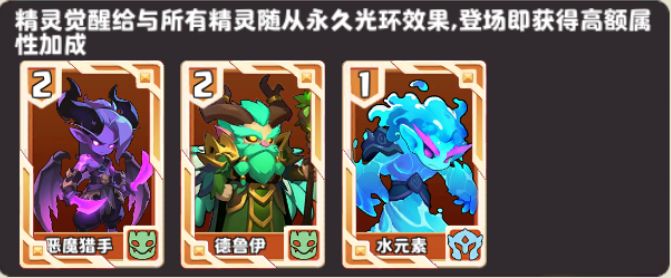 恶魔猎手是精灵体系的核心,推荐围绕精灵随从搭建阵容,阵容里德鲁伊是务必要有的,其余的精灵可搭配水元素、月之祭司等强力精灵随从,主要打法是当手牌集齐德鲁伊和恶魔猎手时,一并放置,护送德鲁伊攻击敌方领主,召唤的小龙也能享受恶魔猎手的加成,无成本形成大军!!而水元素这张牌便能令我们迅速集齐恶魔猎手和德鲁伊!!