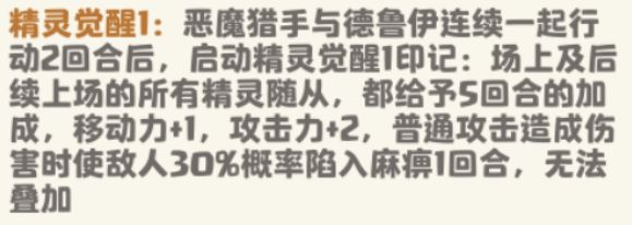 进阶技巧:当恶魔猎手达到5级时,该技能将得到加强,给予的加成效果将提升为移动力+2,攻击力+3,麻痹概率提升至50%,这时我们的每一只精灵随从都将化身高质量卡,就连德鲁伊召唤出来的小龙也将具有高额的攻击力,打对手一个猝不及防!!