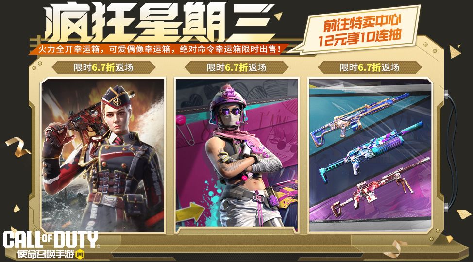 疯狂星期三活动期间,战士们将享受6.7折的超值福利优惠。本次返场的三个宝箱各拥有一次特惠十连抽体验,战士们前往“特卖中心”,花费12软妹币即可十连抽一次!