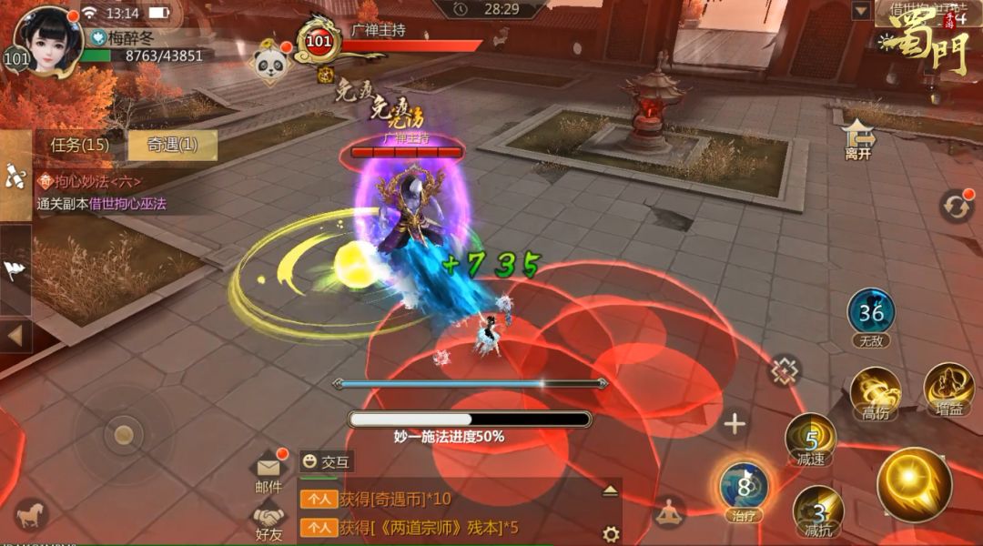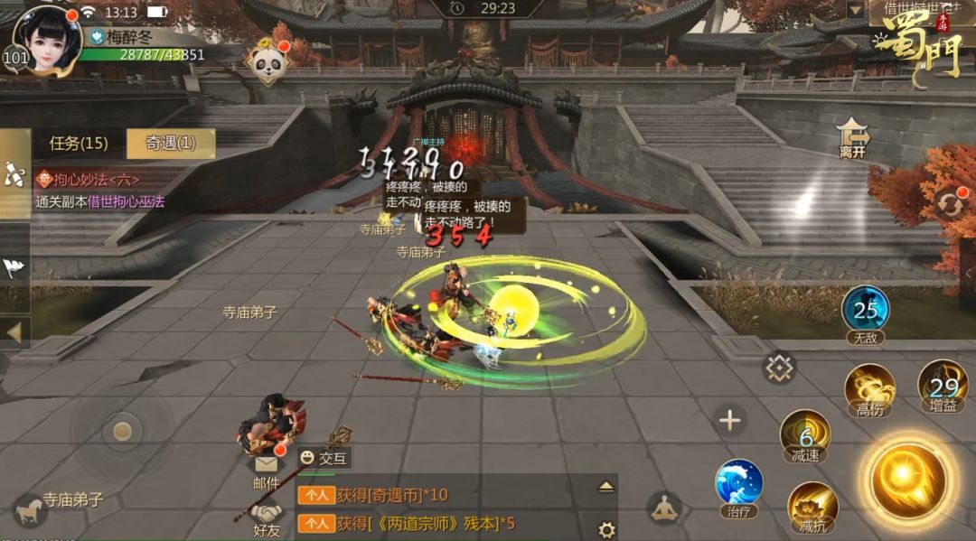 期间需要通关副本“借世拘心巫法”。主持会先让寺庙弟子来教训我们,但这些弟子也与主持貌合神离,只要躲过他们的技能,三两次后,弟子们就纷纷喊疼倒地不再攻击我们了。