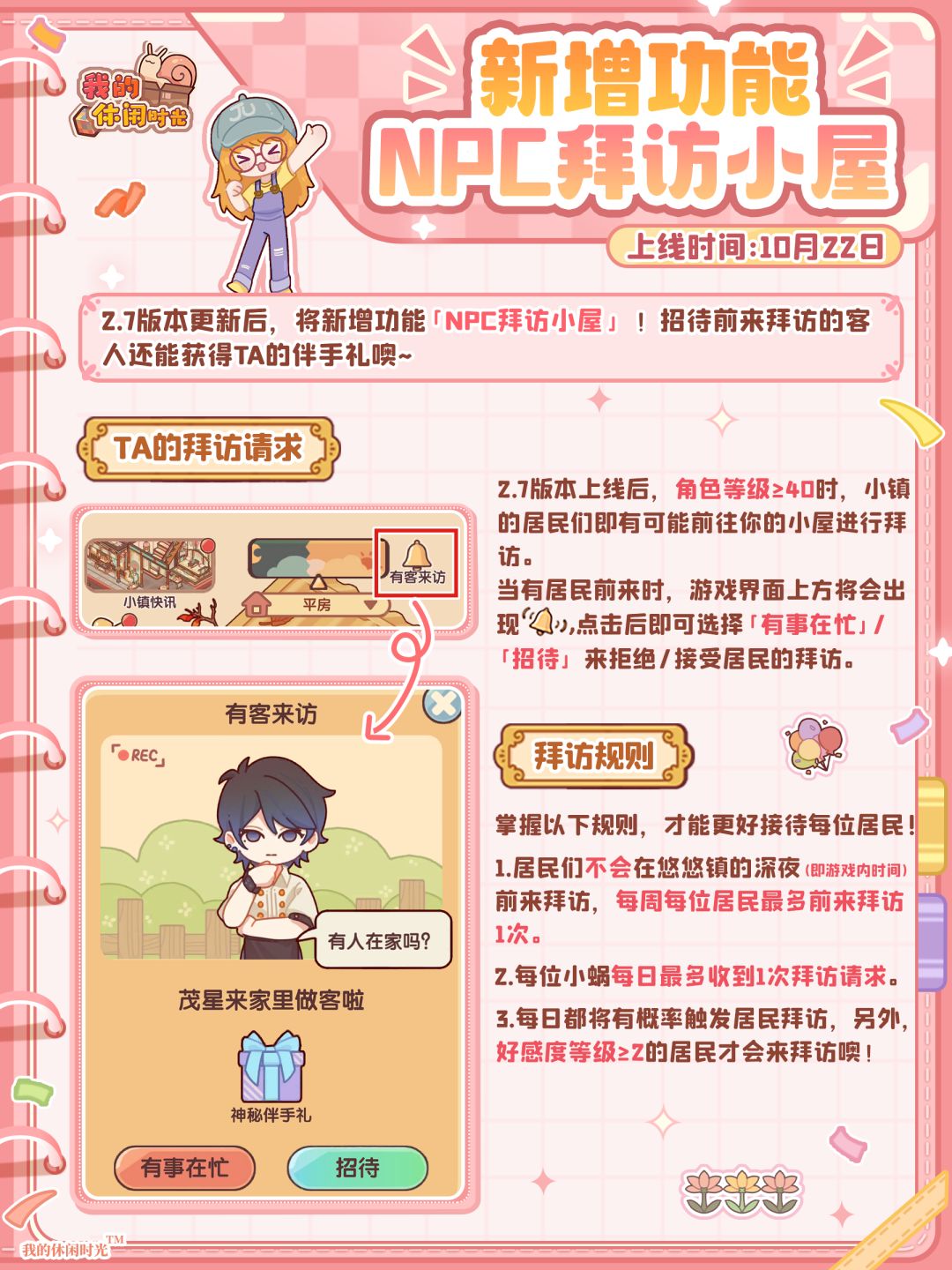 ⭐️10月22日停服维护更新后,将新增「NPC拜访」功能,听说他们还会带着伴手礼来你家做客噢!更多详情戳下图查看~