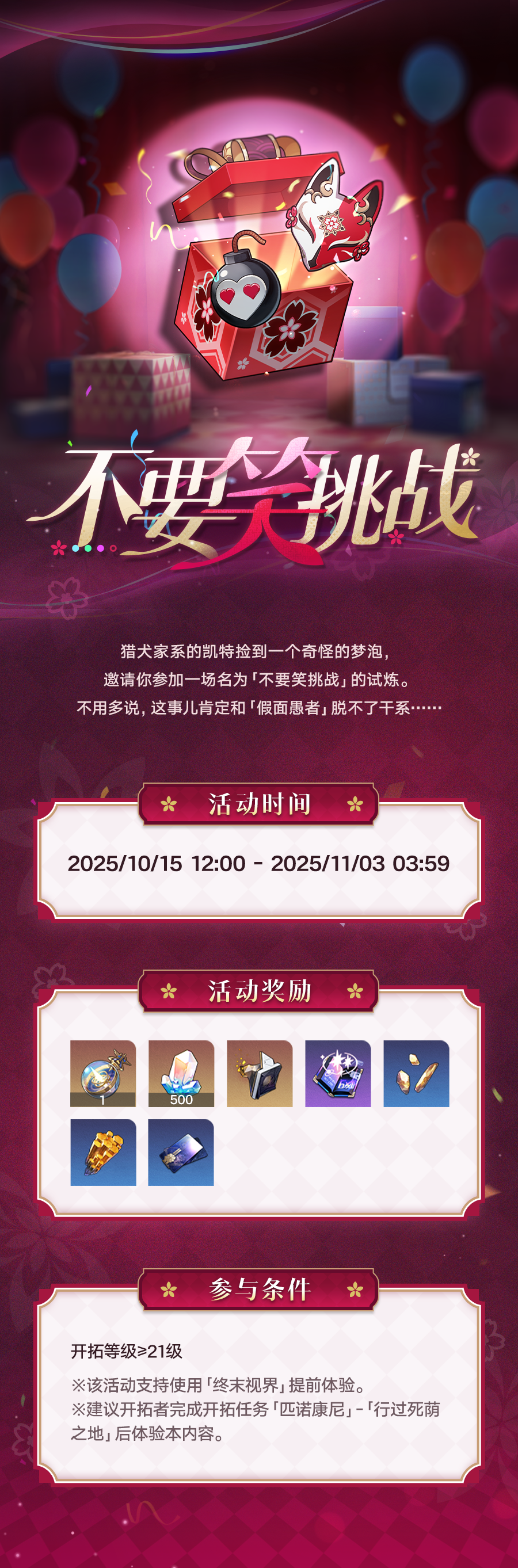 猎犬家系的凯特捡到一个奇怪的梦泡,邀请你参加一场名为「不要笑挑战」的试炼。不用多说,这事儿肯定和「假面愚者」脱不了干系……