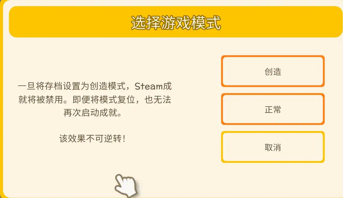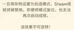 而且存档一旦打开创造模式,Steam成就系统就会被禁用,即使是后面调回正常模式也没用,只能重开新档。