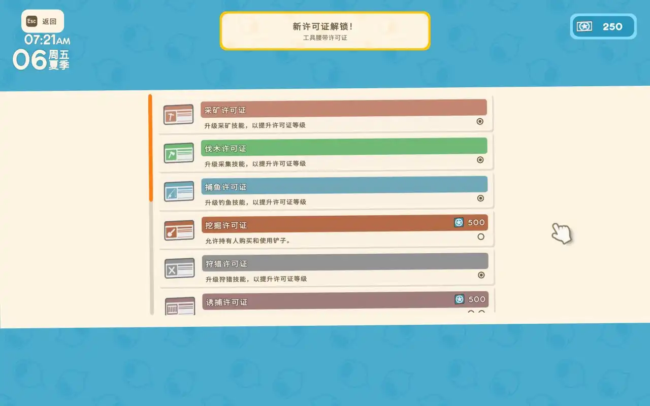 而办理这些许可证需要点数解锁,点数又可以通过收集物品解锁里程碑收集。