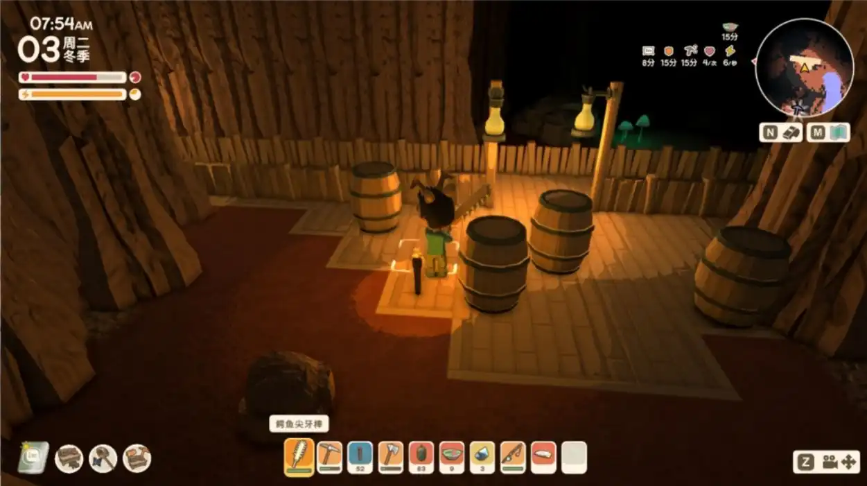 当然,除了休闲的种地生活,游戏也鼓励玩家去野外冒险探索:与丛林中的澳洲特产们斗智斗勇,带回各种材料;或是前往矿洞中下矿采集,,矿洞采用单层平面式设计,资源密集,还有一些木桶和宝箱什么的。