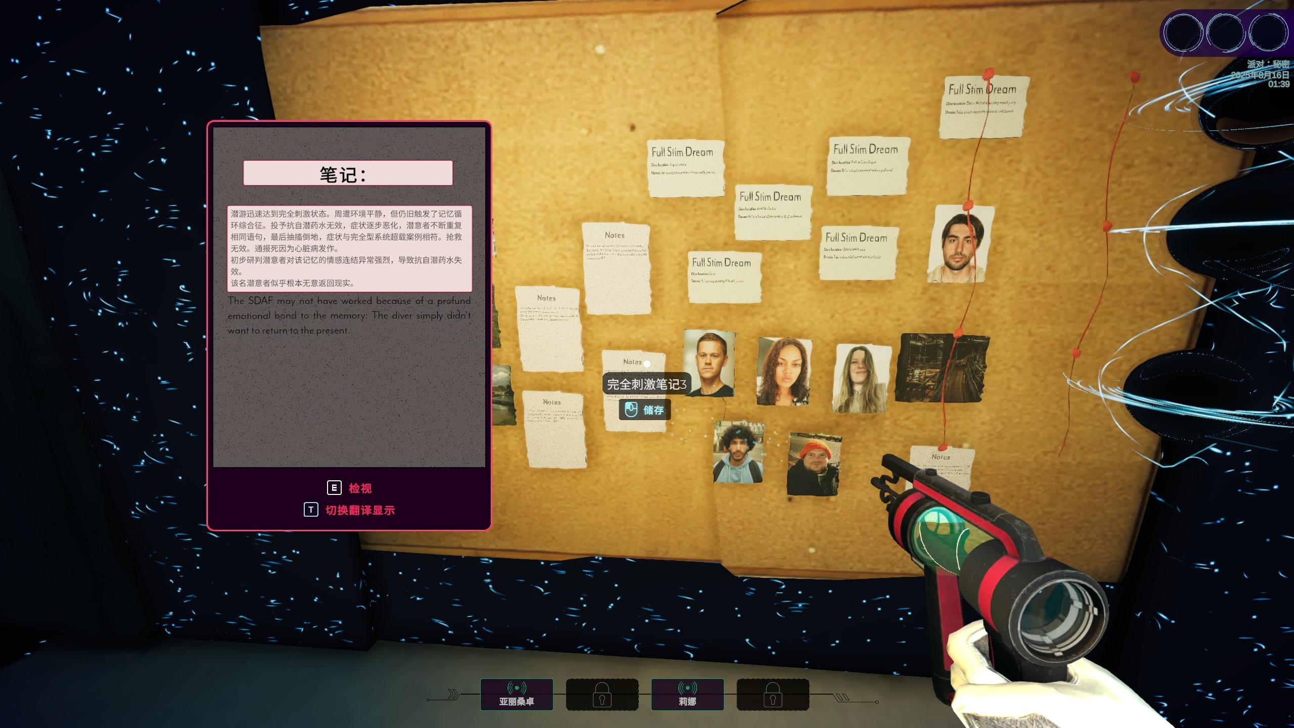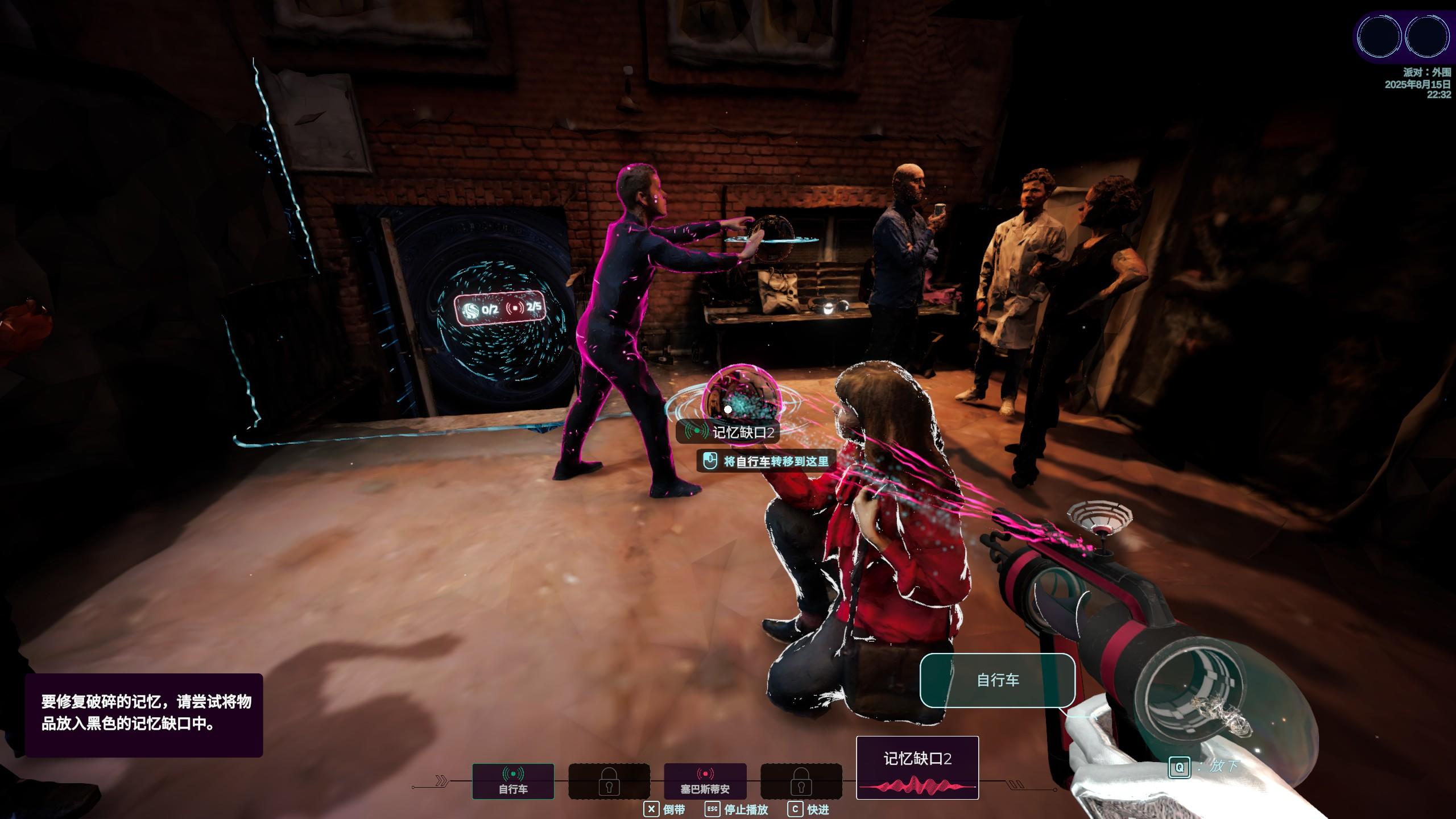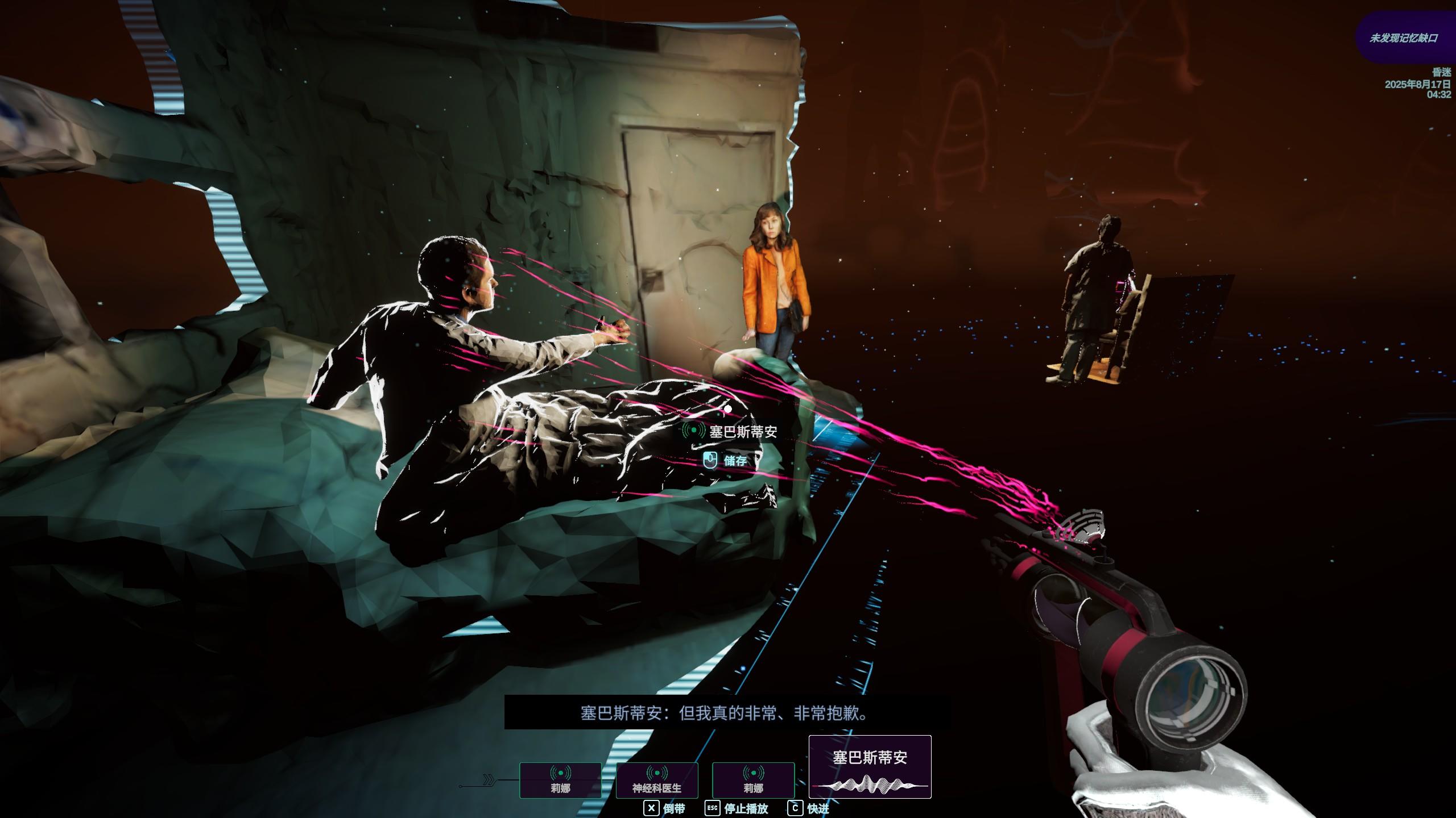 玩家作为潜意者,需要物理意义上潜入记忆的海洋,在各种记忆隧道里发现事件的片段,根据蛛丝马迹将当时的场景和对话还原出来。每到一个新场景,对粉色轮廓的人或物单机右键,就可以听到当时的对话,粉色轮廓附近如果有一个像黑洞一样的球体的话,就是代表我们需要往其中放入对应的物体或人物。我们可以通过对话直接获得线索,也可以通过记忆场景中的一些信件、药方等文字信息间接得知线索。如果成功的话,放入的物体会填补这部分空白,从而解锁新的粉色轮廓物品或人物,我们再次点击它们获得更多的信息。