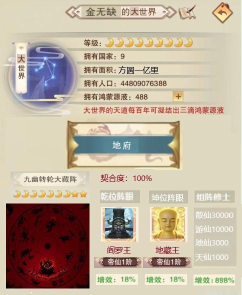 地府解锁后,三界彻底成型(人界,天界,冥界),世界内循环达成,体内世界完善程度大大加深,能增加天道法身的属性,每百年获得地府祭祀供奉,得到功德、愿力等材料。