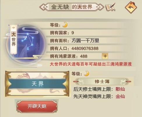 紫府小世界9级后,可消耗一定的先天五太之石升级为大世界。