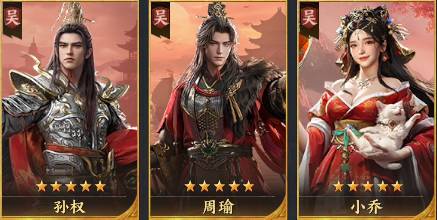 该阵容是以周瑜的群体燃烧为核心,孙权提供强力增伤、群体易伤、射程提升,小乔进行爆发收割的群伤阵容,