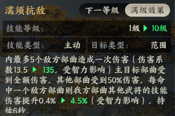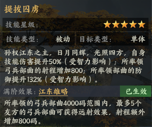 孙权兵书【提拔囚虏】可增加率领弓兵部曲的射程,且满阶还能给范围内数个友方弓兵部曲增加额外射程。这使得该阵容能在更安全的距离发起攻击,优先消耗敌人,减少被敌方骑兵冲锋贴脸的风险,尤其有利于需要时间的燃烧持续输出模式。在“更有利的环境输出”是此阵容的一大战术优势。