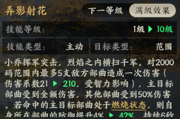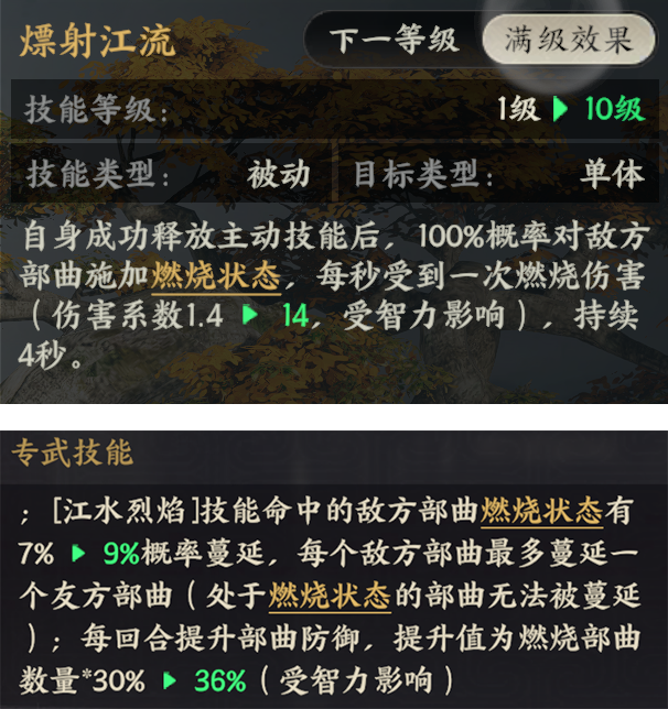 周瑜主动技能【江水烈焰】对范围内敌方部曲施加燃烧状态,同时其专武【吟风逐焰剑】使敌方部曲的燃烧效果概率蔓延到临近部曲,极大提升了燃烧的覆盖率和伤害范围。