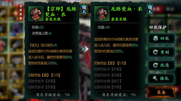 上衣,护肩,项链处的装备每一件都有宗师版本,宗师版本的装备相比于普通版本的装备掉落概率更低且无法通过宗师锻造获取,但会增加一个蚀灭增伤+5以及杀意值上限+3的词条。