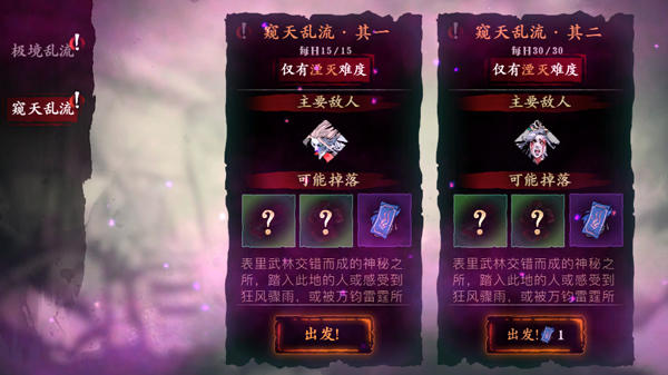 玩家可通过劫境铃铛处新开放的「赛季试炼」-「窥天乱流」副本进行新赛季装备、刻印的获取,副本将分为两种: