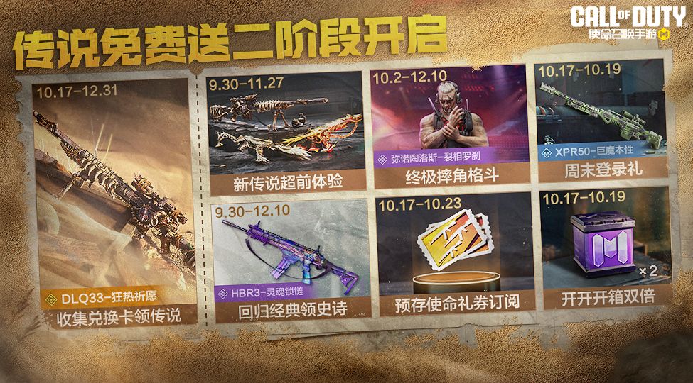 10月17日(本周五),新传说免费送活动二阶段震撼来袭!战士们参与活动,即可获得兑换卡,当兑换卡达到100张,就能获得传说级武器DLQ33-狂热祈愿啦!