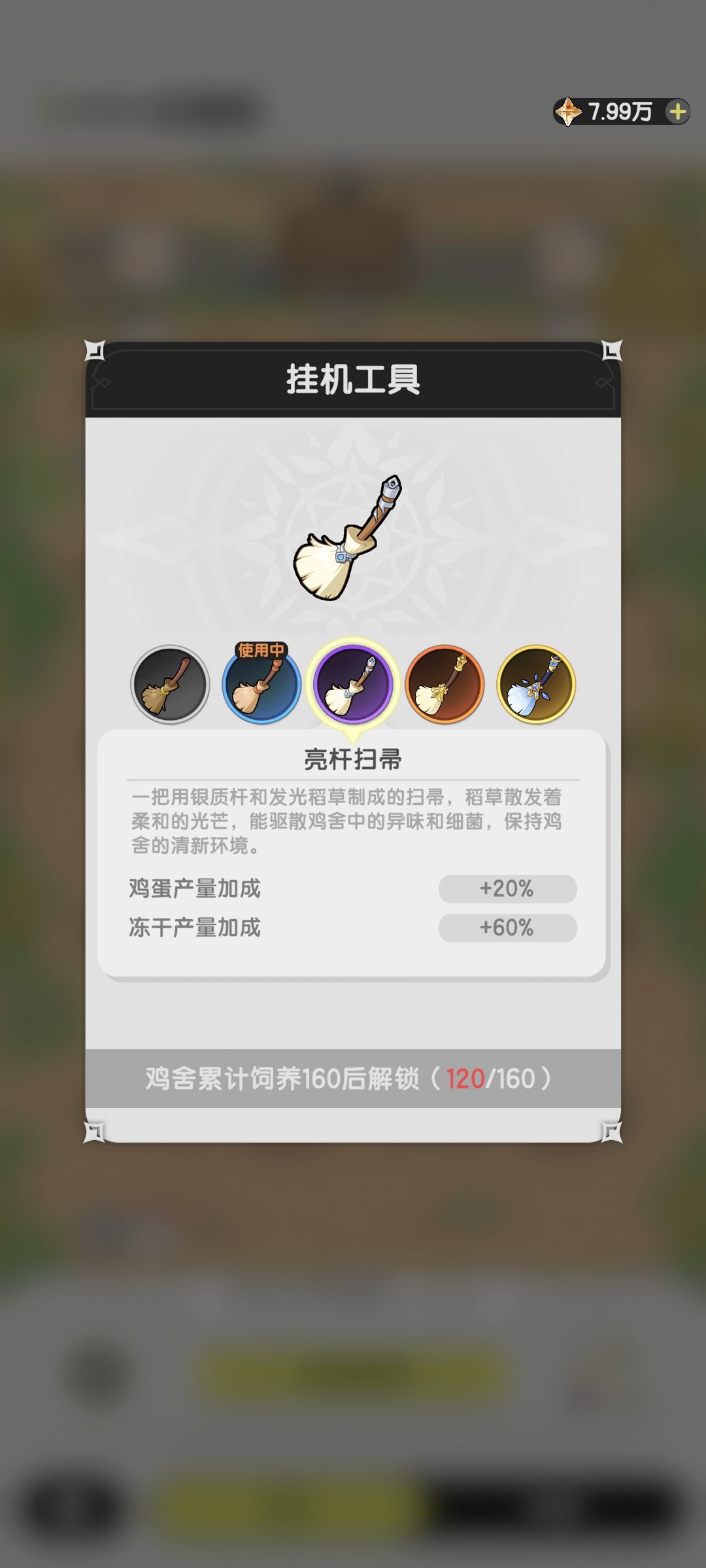蓝扫帚游戏很多玩家基本上都解锁了,它的加成是鸡蛋产出加百分之10和冻干加成百分之30。