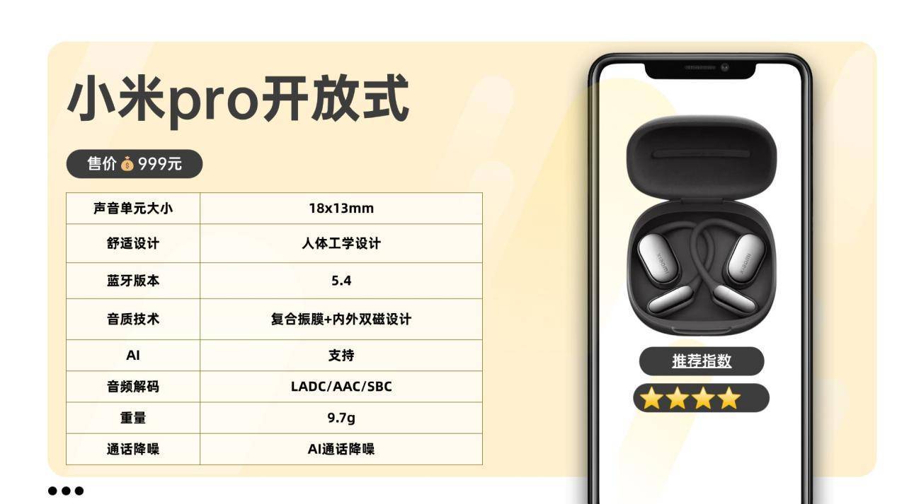 配置方面,耳机搭载蓝牙5.4芯片,实现低延迟和高稳定性传输;总续航可达36.5小时,支持快充与多项智能交互功能。整体来看,小米Pro在音质、佩戴舒适度和功能性之间取得了良好平衡,以远超同价位的表现,成为开放式耳机市场中的高性价比选择。