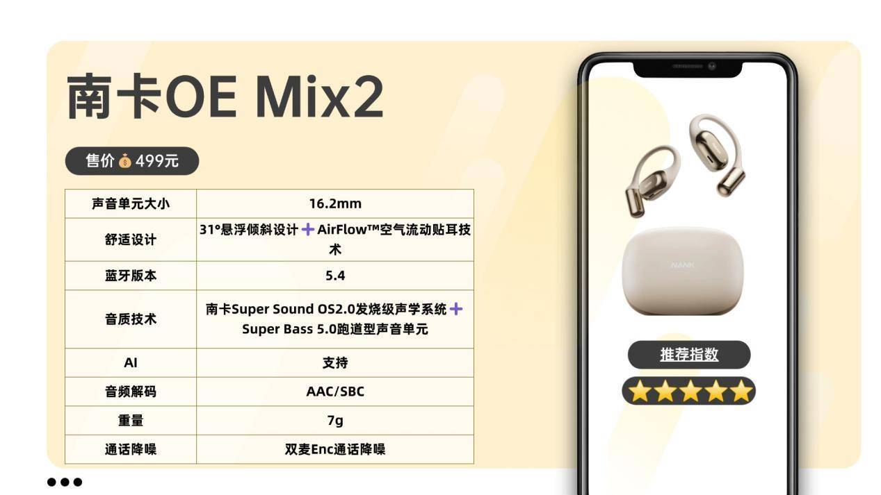 配置方面,OE Mix2搭载蓝牙5.4芯片SOC,带来更高通信效率和抗干扰能力,实现秒连秒响。低延迟保证音画同步,双麦智能降噪可有效过滤多频段环境噪音,确保通话清晰自然。耳机还具备IPX5防水、24小时续航及十余项AI功能,使得南卡OE Mix2在性价比上远超同类产品,甚至可媲美千元级旗舰机型,堪称今年百元级开放式耳机的最佳选择。