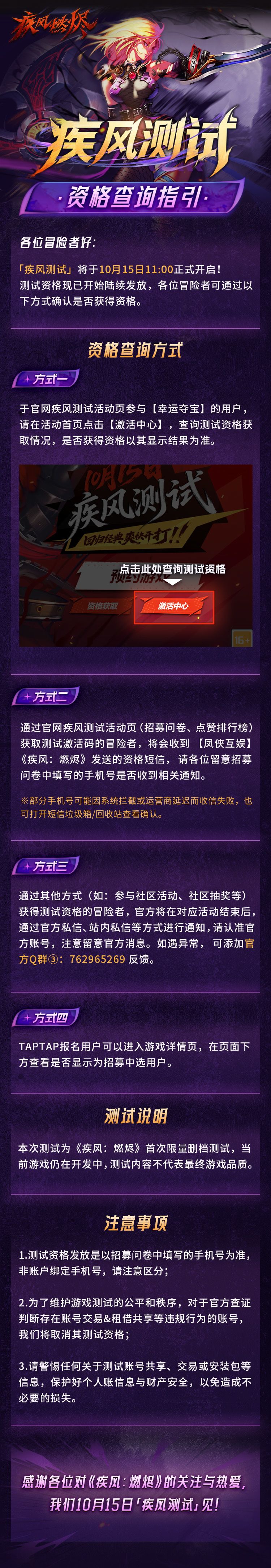 2、于其他方式(如:媒体发码、参与社区活动、社区抽奖等)获得测试资格的冒险者,官方将在对应活动结束后,通过官方私信、站内信息等方式进行通知,获取后请自行到官网疾风测试活动页激活。