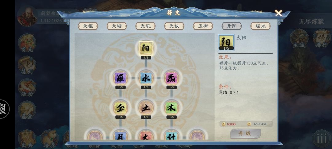 ②圣阳:全军防御力+25%;需消耗天地元石*10、前置计都点满