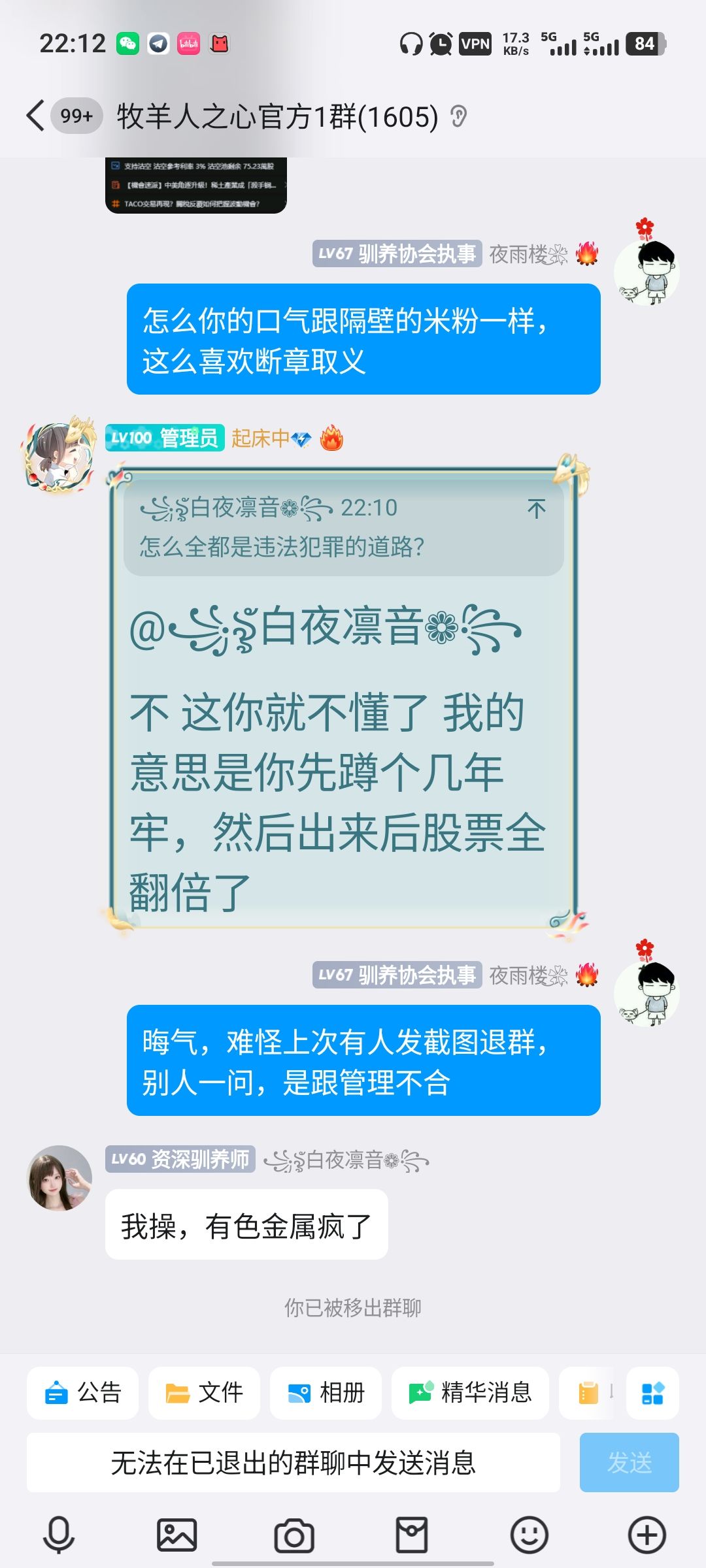 大概事情是:这位“好”管理在群里面挥斥方遒,在跟群友诉说他的投资经验,我在闲聊的时候说了一句长期持有还真得看黄金,以后慢慢的会跌到五六百。他个人对我这种行为嗤之以鼻。这就算了,毕竟每个人投资看法都不同嘛,后来我争论几句,带到了前段时间有人退群,跟别人私聊说原因是跟管理不合时(潜意思是他的脾气不好,有人跟他不合是正常的)这位“好”管理立马动用管理特权将我踢掉。