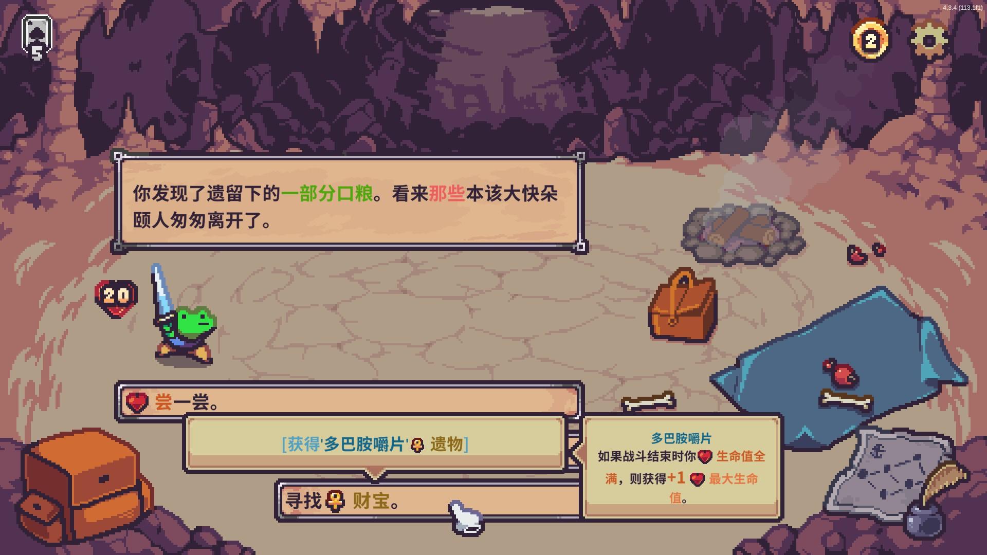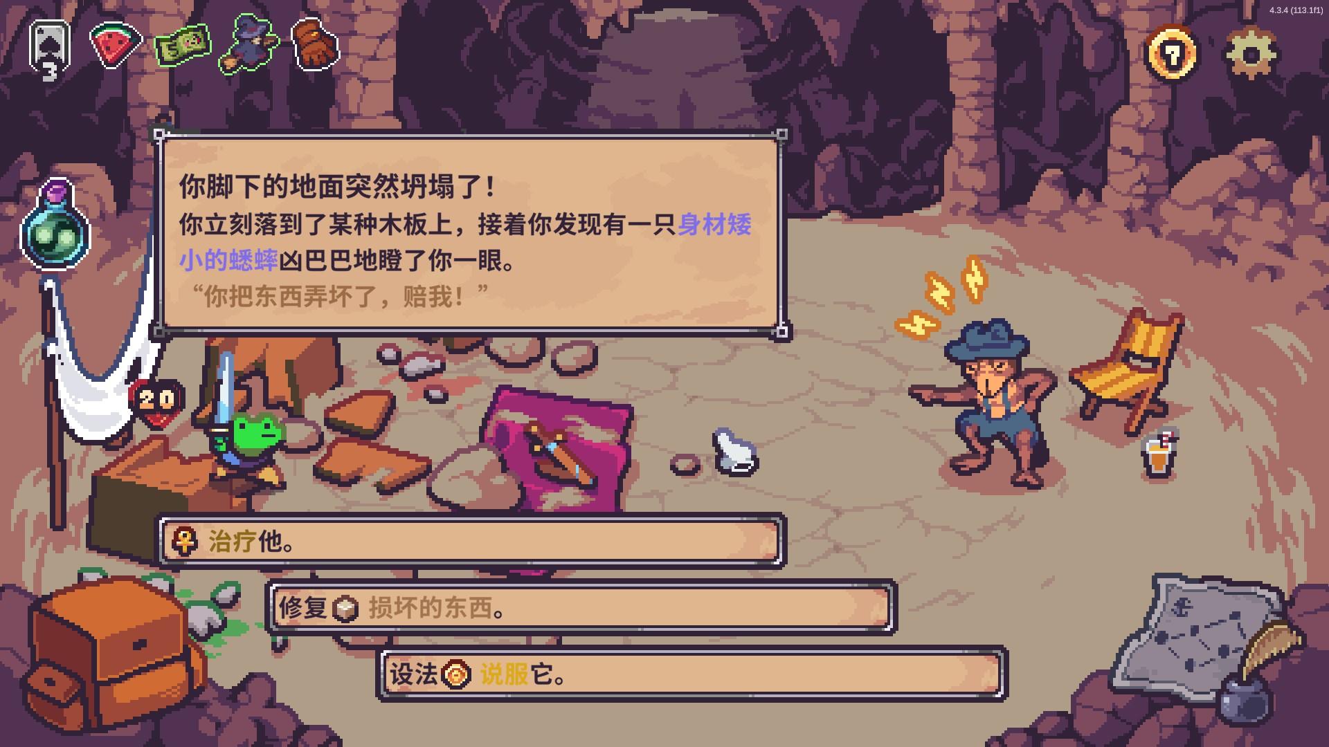 该游戏的画面采用了像素画风,UI设计十分讨喜,以回合制的形式呈现战斗场景,该游戏的操作简单,在刚开始就有详细的教程引导,跳过有趣的以闭嘴的形式出现,有种跟引导蛙对话的感觉。