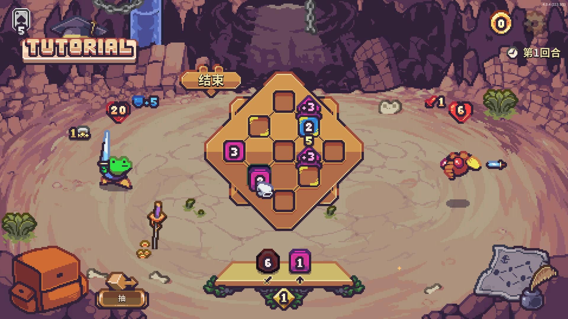 战斗开始时,会从类似大背包的抽牌堆中随机出现骰子在下方类似托盘的手骰中,骰子有着攻击、格挡和治疗三种不同颜色,并且自身也有类别和投掷的点数,还有特殊属性,你可以自己选择骰子放置在中间菱形骰子盘中方形的格子里。