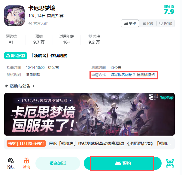 • 请您务必确认招募问卷中填写的个人信息准确无误(问卷提交后不可修改),后续的资格发放和游戏下载方式将通过短信、平台私信的方式进行通知。