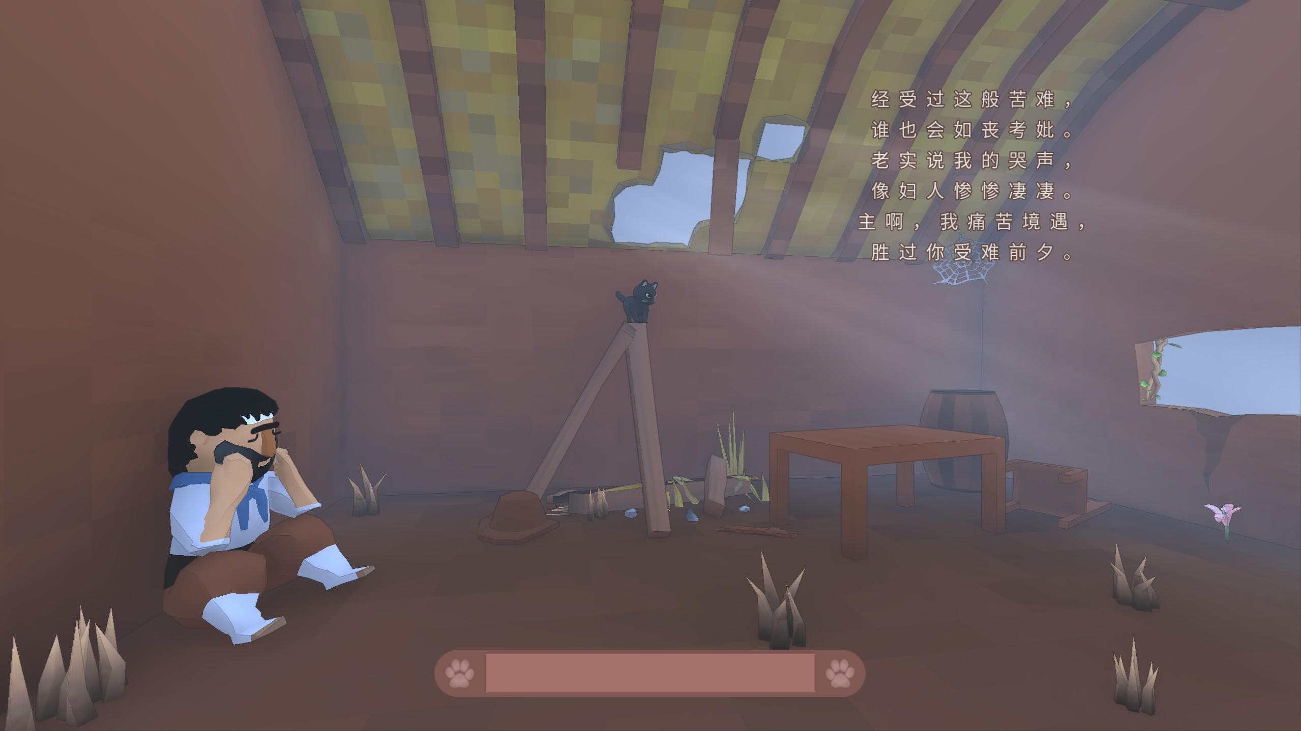 第四段是记顺序小游戏,主角回到了老家,发现这里早已物是人非,妻子和孩子都不知道去往了何处,只剩下断壁残垣和一只可爱的黑猫。
