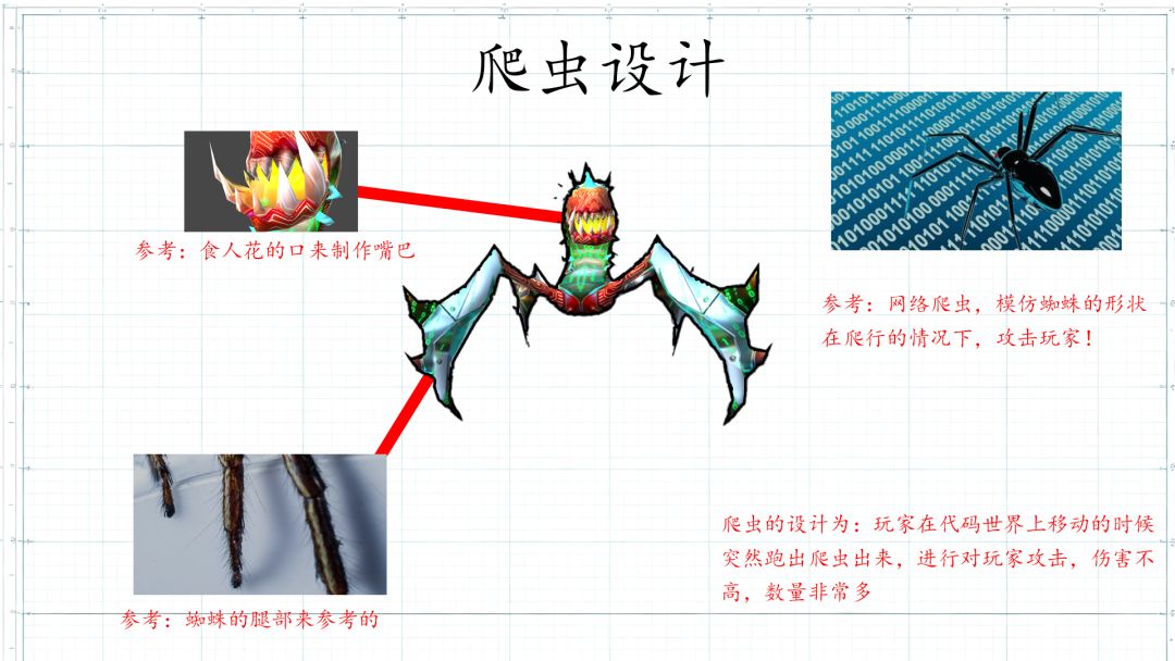 今天找了很多参考,准备弄一些怪物设计,是这样想的,做哪些BUG病毒哪些怪物,今天的进度弄了4个怪物的设计,基本上大概的方向已经定的差不多了,