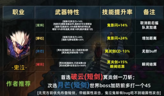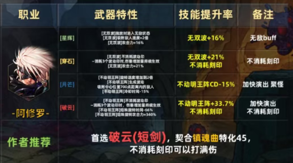 ③:鬼泣;首选改变技能形态的破云短剑系列,冥炎剑进化成一刀斩,其次选择月芒减少CD,能更高的提供技能循环