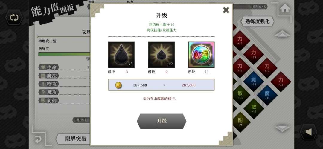 而角色升星则是在能力值面板全部解锁完毕以后,只要达到当前星级的熟练度上限,在此界面消耗对应的素材就能成功升星。