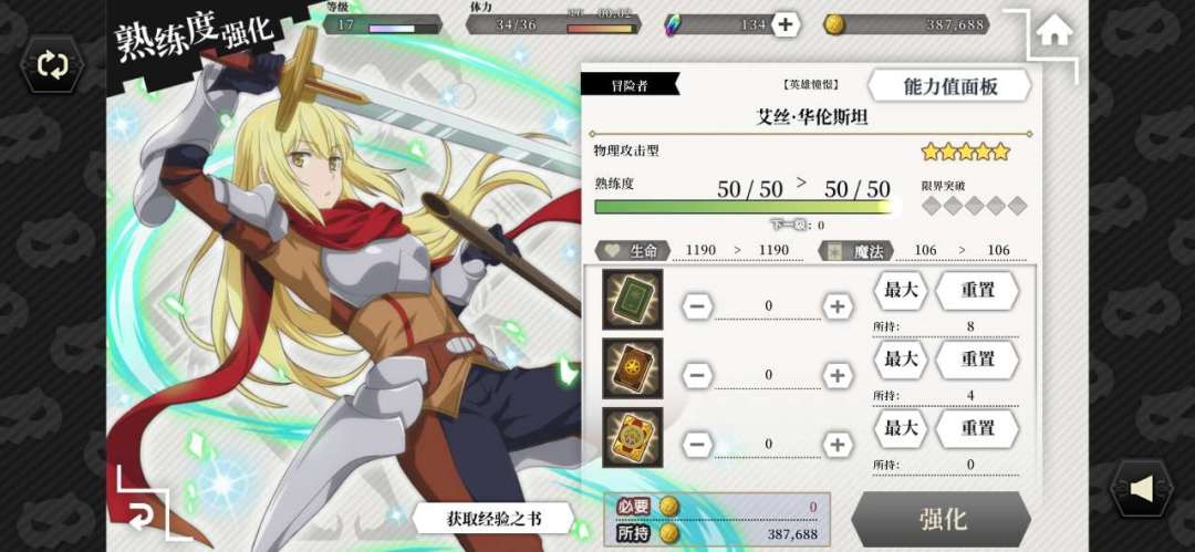 熟练度等级就是角色的等级,不同星级的角色等级是有上限的,例如5星的艾丝.华伦斯坦上限等级就是50级,想继续提高等级需要完成上面介绍的升星流程,成功突破至6星以后,等级上限就由50级提高至60级。
